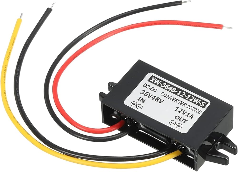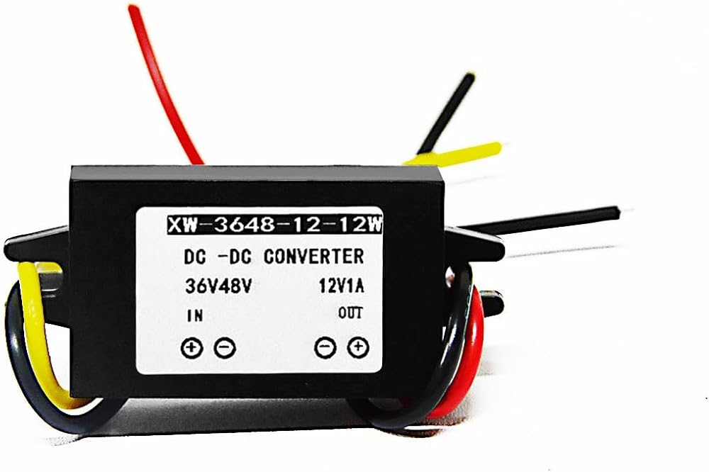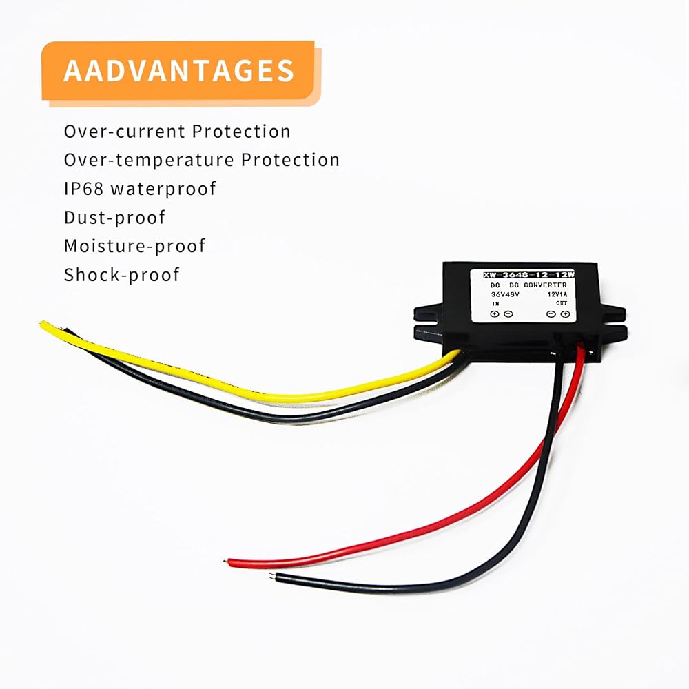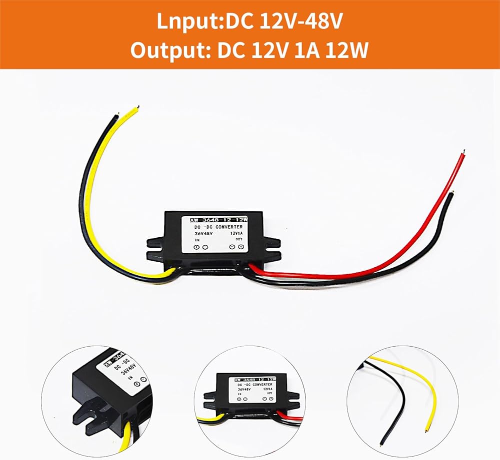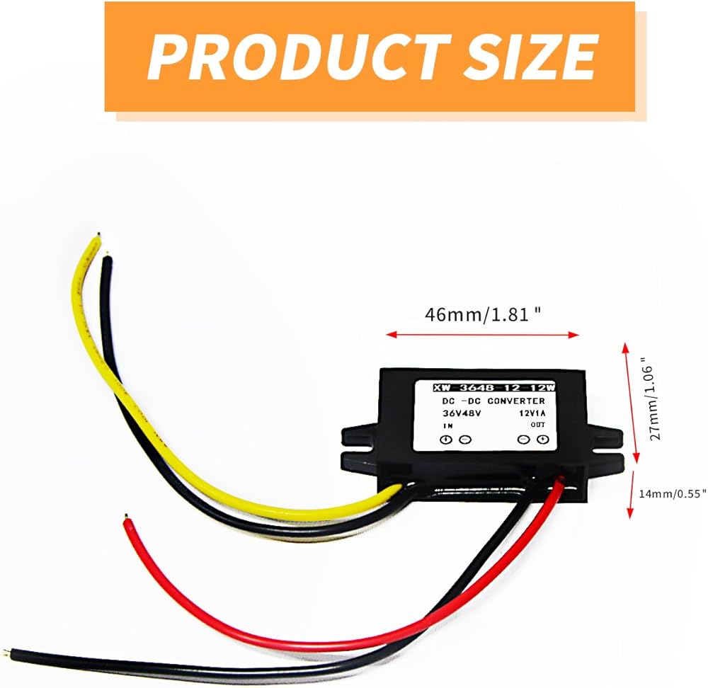 Input Rated Voltage: DC 36V 48V; Output: DC 12V 1A 12W; Size: 46mm x 27mm x 14mm/1.81 inch x 1.06 inch x 0.55 inch(L*WH); Mounting Hole Diameter: 4mm/0.16 inch; Mounting Hole Distance: 2.2 inch.
