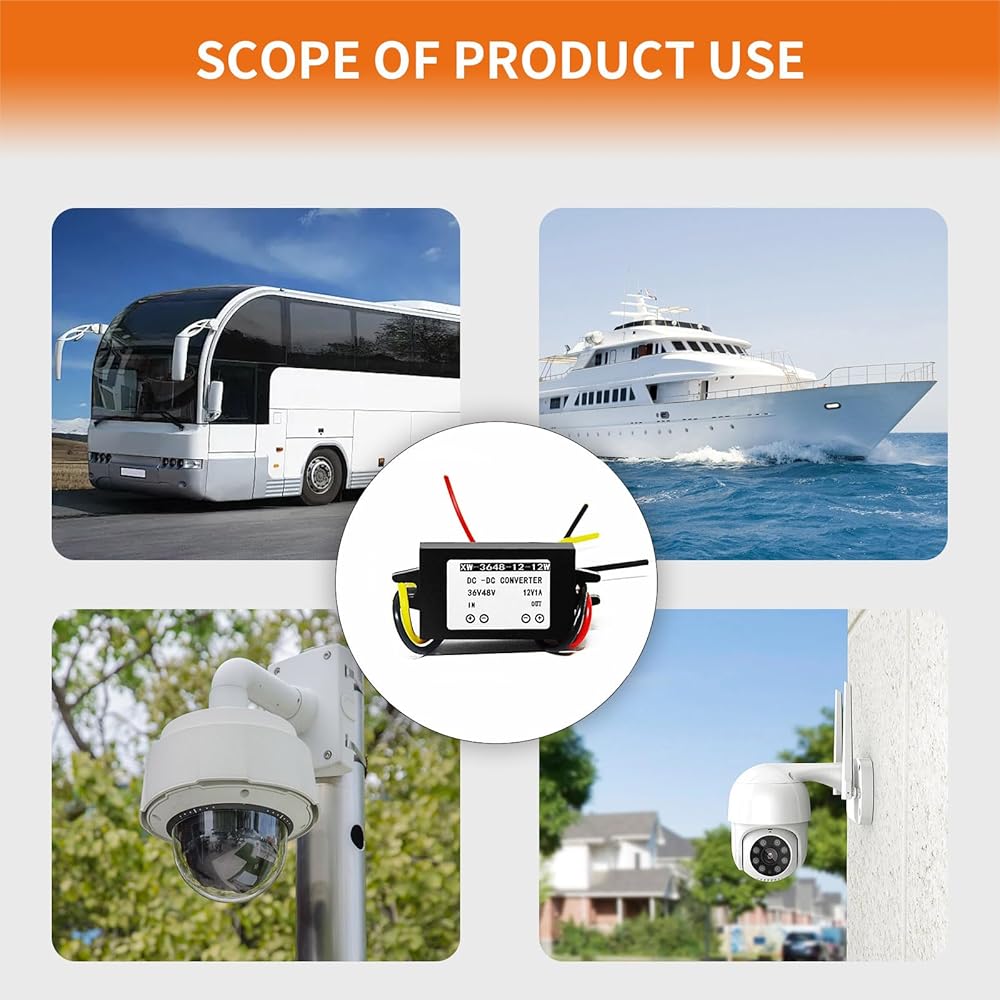The power converter regulator is made of ABS plastic, safe and reliable, flame retardant plastic shell, fit for car screens, fans, water pumps, motors, surveillance cameras, routers, snow blowers, steam showers, etc