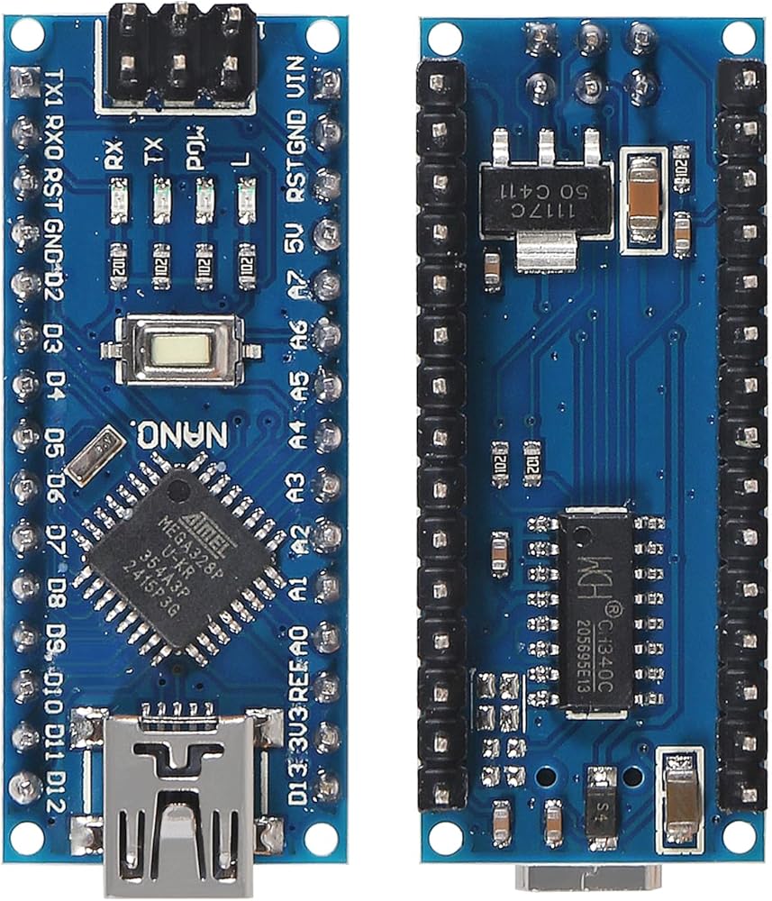 Nano V3. 0 ATMEGA328P Improved version with 3pcs pin headers soldered (2pcs 15pin headers +1pcs 6pin headers). Each of the 14 digital pins on the Nano can be used as an input or output.They operate at 5 volts. Each pin can provide or receive a maximum of 40 mA and has an internal pull-up resistor (disconnected by default) of 20-50 kOhms. In addition, analog pins 6 and 7 cannot be used as digital pins, some pins have specialized functions.