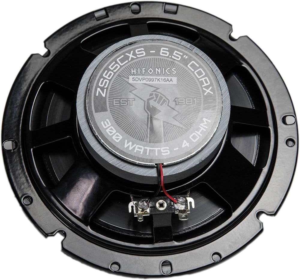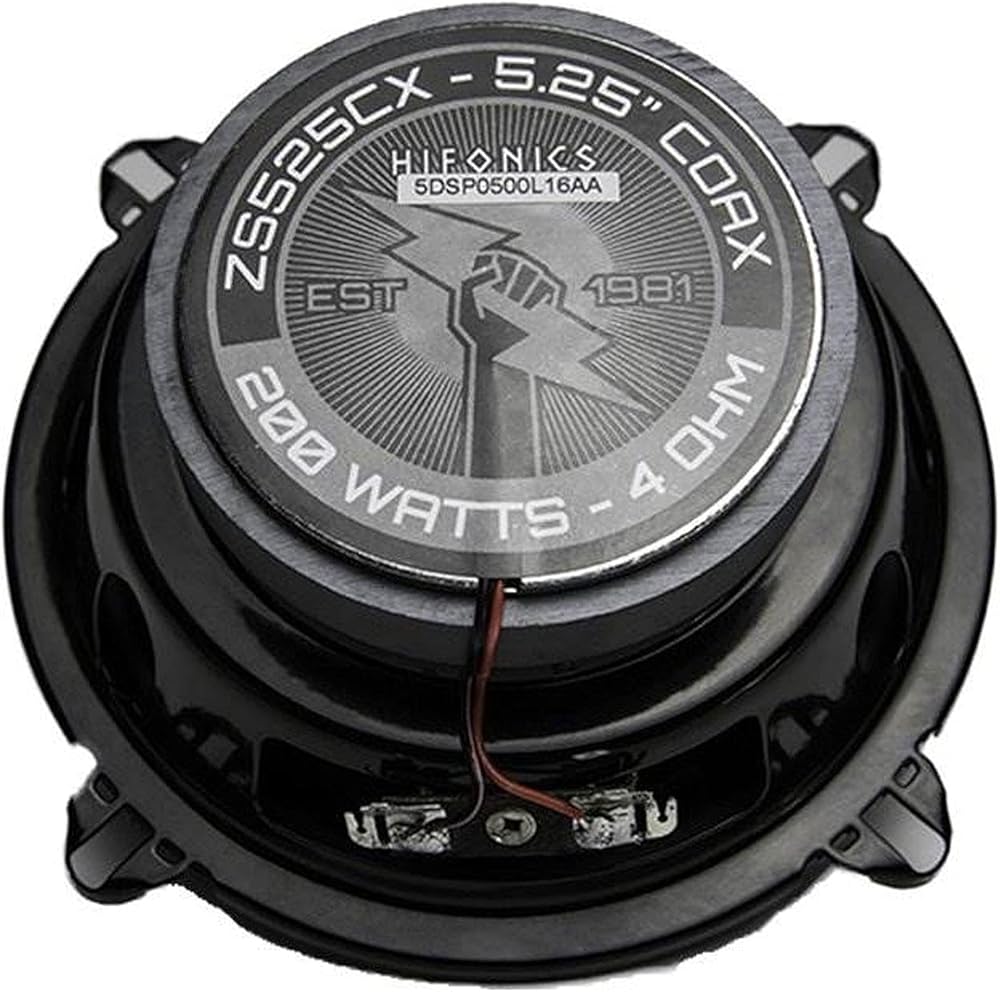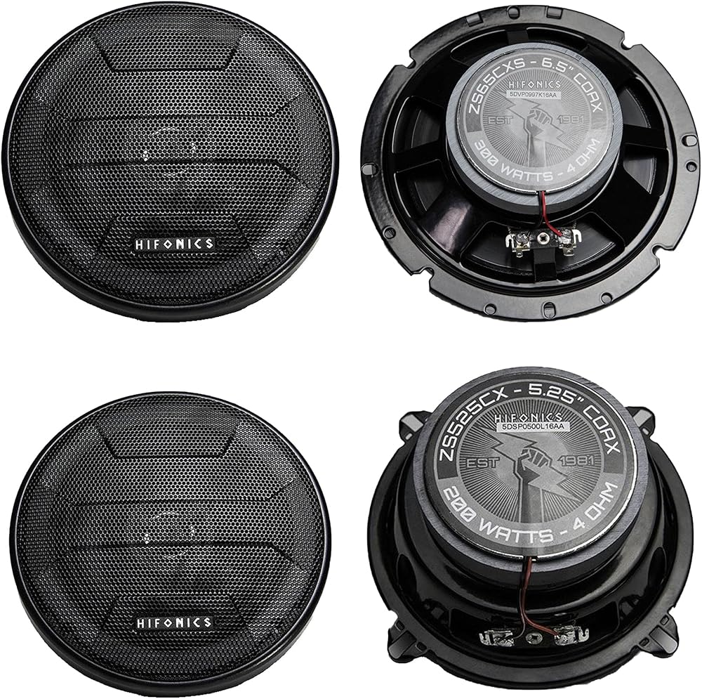 Amp up how you listen to your car's audio with a pair of the Hifonics Zeus ZS65CXS 6.5-Inch 3-Way 300-Watt Shallow Mount Coaxial Speakers. These shallow mount coaxial speakers have neo mylar soft dome tweeters built to resist impact, are reliable, and provide superior audio quality. The 1-inch tweeters are able to clear highs and handle high power without sounding harsh. Rubber surrounds also provide high mid-bass impact. Alpha cellulose poly woofer cones are extra lightweight and rigid for increased speed and deep base. Passive butterworth crossovers provide smooth transitions of frequencies and anti-resonant stamped steel basket frames keep harmonics to the minimum by preventing distortions from flexing or ringing. The mounting diameter is 5.59 inches with a mounting depth of 1.65 inches. This package also includes a pair of Hifonics Zeus 5.25-Inch 2-Way 200-Watt Coaxial Speakers that pack a punch. Made from neo mylar and alpha-cellulose that's nearly as strong as the Greek god himself, these speakers stand protected against moisture and impact. Additionally, the frame is made from anti-resonant stamped steel, which prevents distortions that could affect your sound. The mounting diameter is 4.48 inches with a mounting depth of 2 inches.