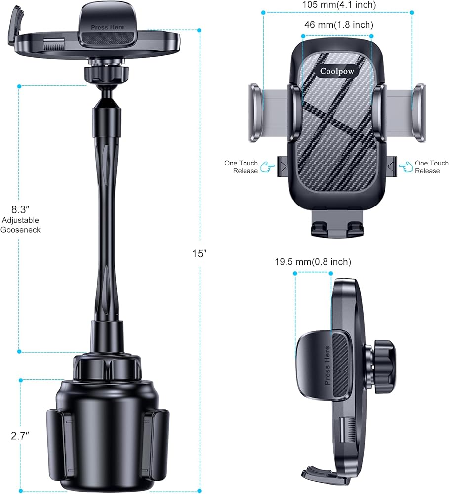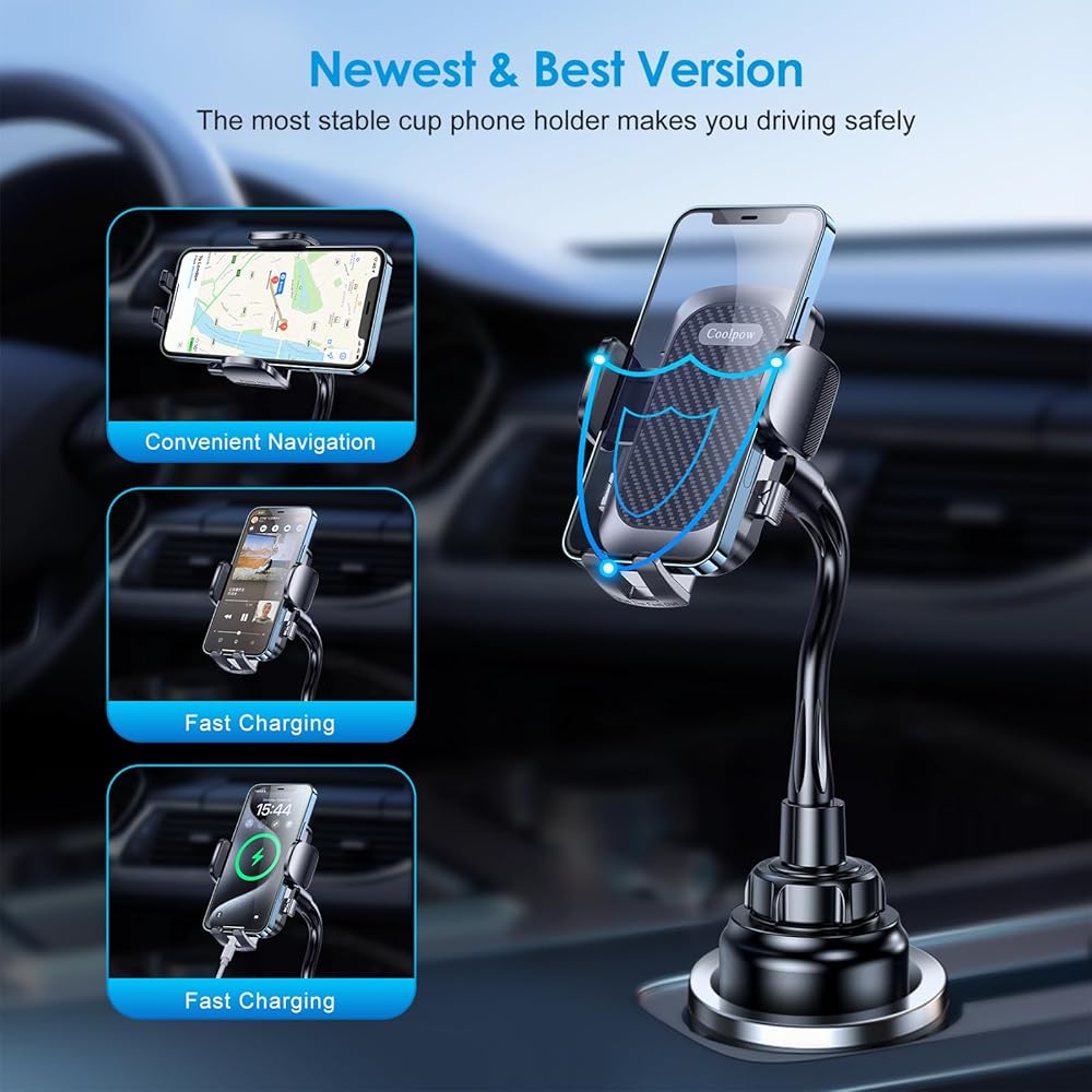 Secure and Convenient : Our Cup Holder Phone Holder for Car provides a secure and convenient way to mount your phone while driving. Designed to fit most standard car cup holders, this adjustable holder eliminates the need for extra tools. Just place it in your cup holder and fix it securely without any need to affix anything to your dash or window.