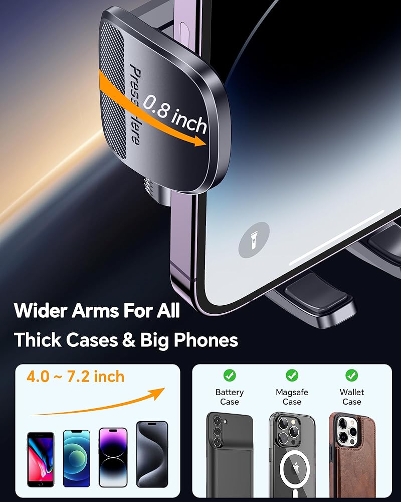Big Phone & Thick Case Friendly : Deeper and wider adjustable clamping arms and adjustable feet are designed to allow our car phone mount to accommodate larger and thicker phones and cases. Fits all 4-7 inch phones such as iPhone 15, 14, 13, 12, Pro, Max/Plus/Mini, Galaxy S22/S21 and more. In addition, Otter box case, Wallet case, Thick case, Mag safe case, etc. are all compatible.