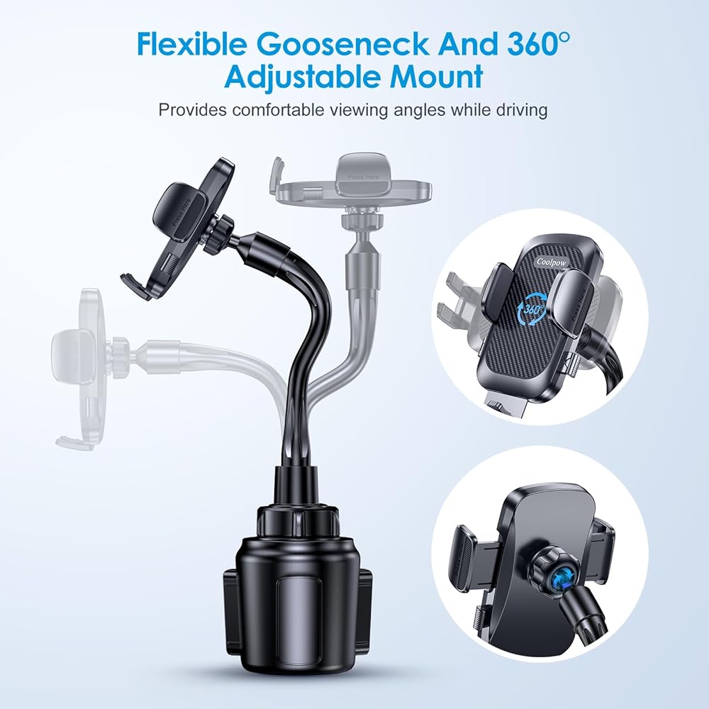 Stable and Shake-Free : Say goodbye to shaky phone mounts that make it difficult to view your phone while driving. Our Cup Holder Phone Holder is built with an adjustable heavy base and a strong neck, ensuring that your phone remains stable and secure. The flexible swivel ball allows for 360° rotation, and the jointed arm enables easy movement and optimal viewing angles. Whether you're talking, navigating, listening to music, or charging, you can trust in the stability of our holder.