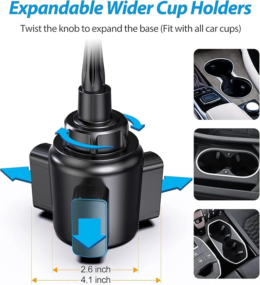Protection and Versatility : Our Cup Holder Phone Holder features soft silicone pads on the arms and feet, ensuring that your phone stays scratch-free. The adjustable base can be easily modified from a minimum of 2.6" to a maximum of 4.1", providing a snug fit in most standard car cup holders. This versatile holder not only keeps your phone within easy reach, but it also provides a safe and optimal viewing angle for a wide range of activities while you're on the road, Various cup holders for cars, trucks, RVs, boats, golf carts, etc.