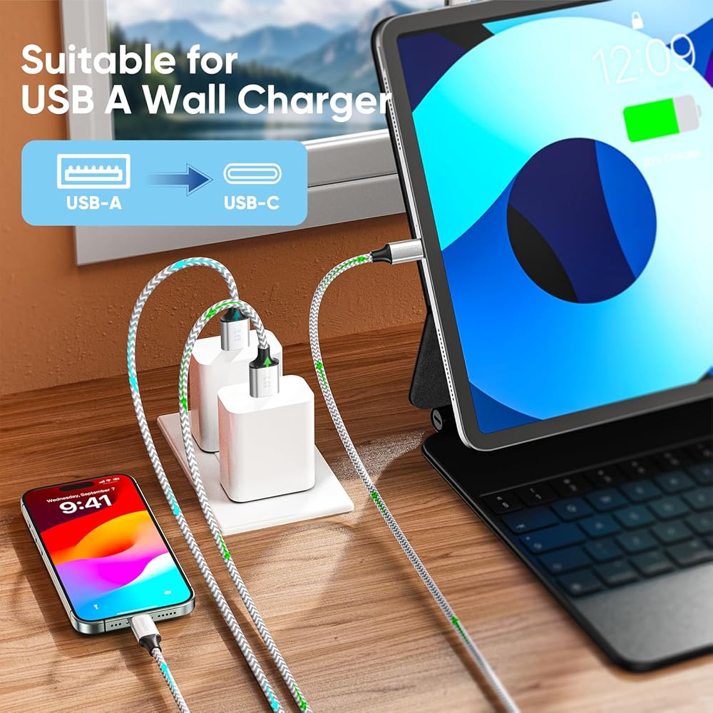 كابل USB A إلى USB C بطول 6 أقدام، 2 حزمة، شحن سريع 60 واط (3A 20 فولت) USBA إلى USBC، سلك CarPlay لمنفذ C لنقل البيانات بسرعة 480 ميجا بت في الثانية لهاتف iPhone 15/Pro/Max، وسلسلة Galaxy، وسلسلة Pixel، وiPad، والشاحن والمزيد