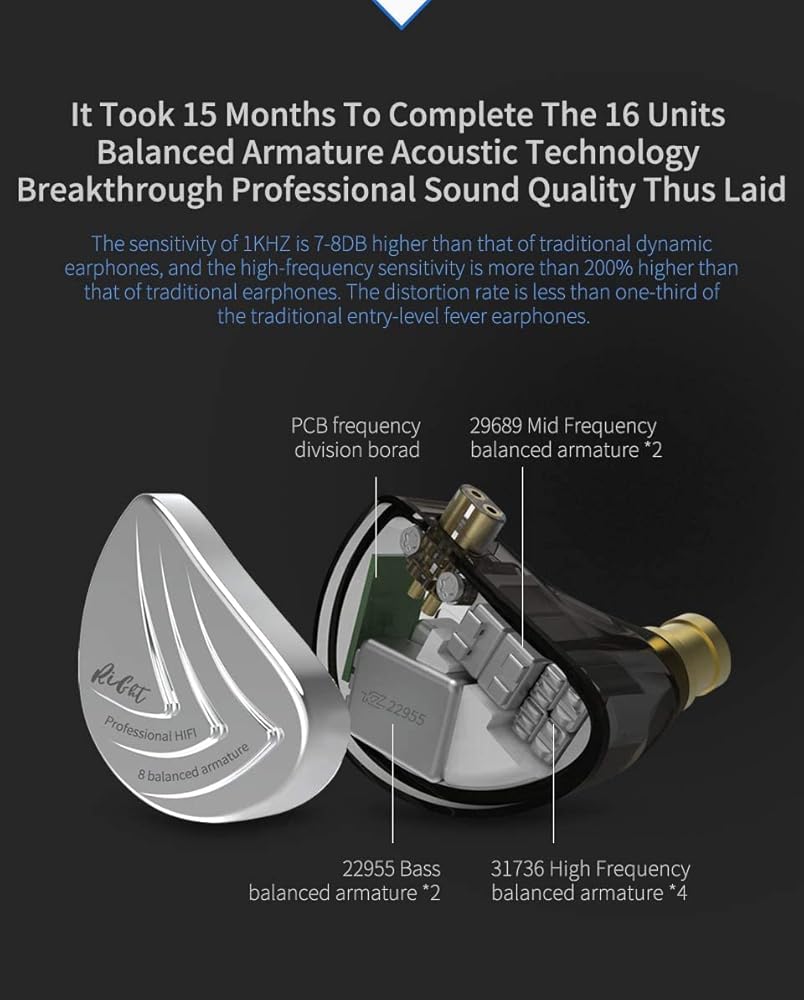 Pure Balanced Armature Drivers KZ AS16: The Newest KZ AS16 pure balanced armature HIFI earphone equipped 8 armature drivers in each side, reference level high-end HIFI AS16 earphones bring you near-real auditory experience on the spot. Before it appearance, the similar configuration, the sound quality is close to the product, the price is basically far over this KZ AS16 headphones.