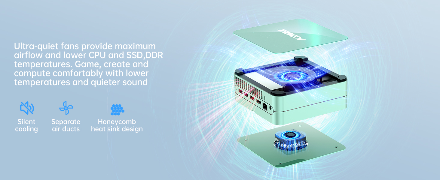 【نظام تبريد صامت قوي】يتميز الكمبيوتر الصغير بجسم متكامل من الألومنيوم مزود بنظام تبريد صامت قوي ومتقدم، وهيكل شبكي كبير مع مراوح عالية الجودة ومغاسل حرارية فعالة للحفاظ على درجات حرارة التشغيل المثالية. غرفة بخار + 45 وات TDP، يتضمن جهاز الكمبيوتر الصغير ACEMAGIC حل التبريد الأمثل لإطلاق العنان للأداء القوي للآلة.
