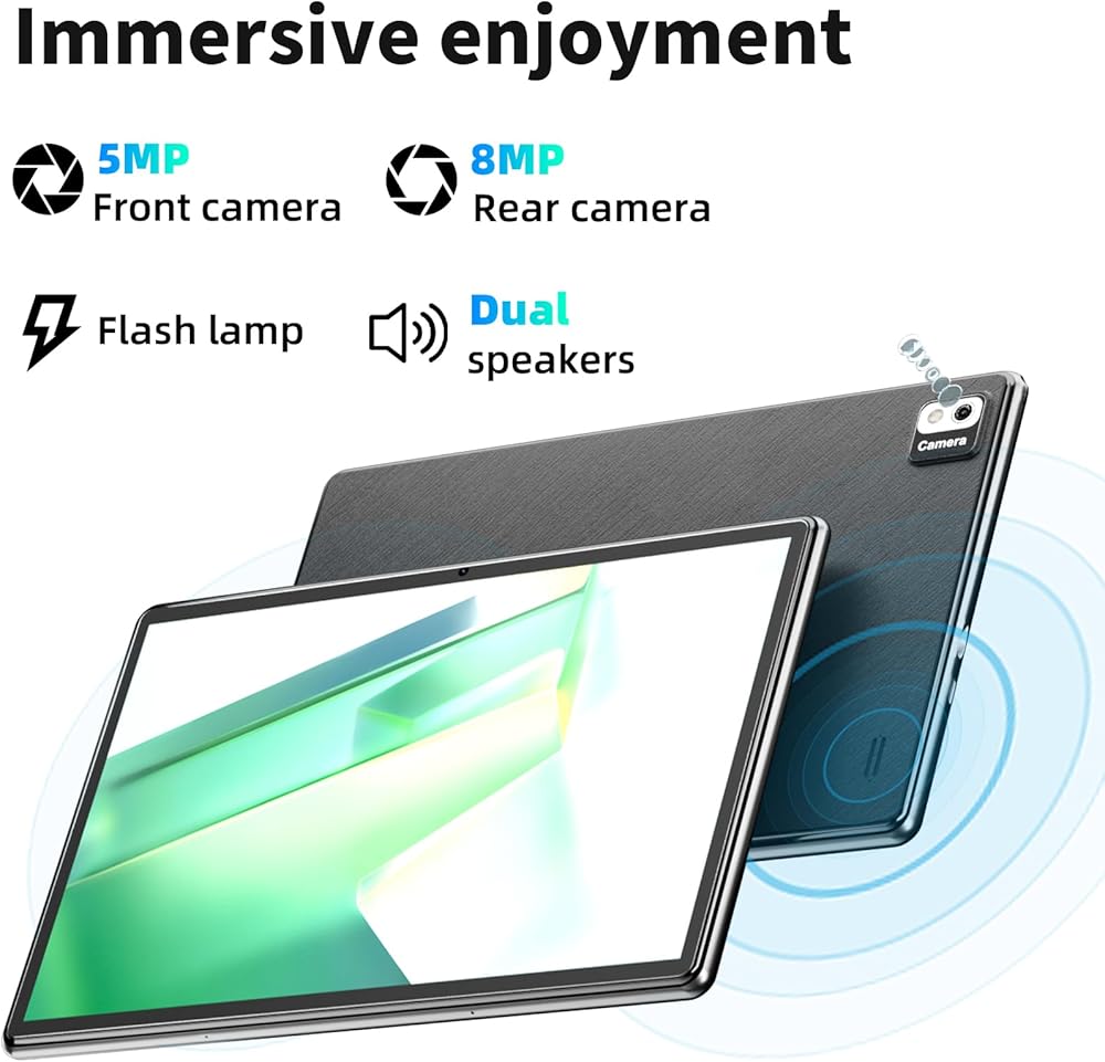【دعم الأجهزة والمنافذ متعددة الوظائف】هذا الجهاز اللوحي للألعاب مقاس 10 بوصات مدمج في كاميرا أمامية واضحة بدقة 5 ميجابكسل وكاميرا خلفية بدقة 8 ميجابكسل، وبلوتوث 5.0، وواي فاي مزدوج النطاق (2.4 جيجا/5 جيجا)، ومكبرات صوت مزدوجة، وواجهة من النوع C (يتضمن الشاحن السريع)، وفتحة Micro TF، ومقبس سماعة الرأس مقاس 3.5 ملم. نقدم لك مجموعة كاملة من التجارب الصوتية والمرئية وتلبية الاحتياجات في سيناريوهات الاستخدام المختلفة.
