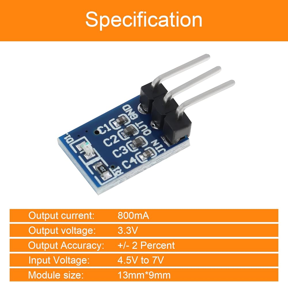 AMS1117-3.3 is a positive voltage regulator step down power supply module, support DC 4.5-7V input and 3.3V fixed voltage and 0.8A current output.