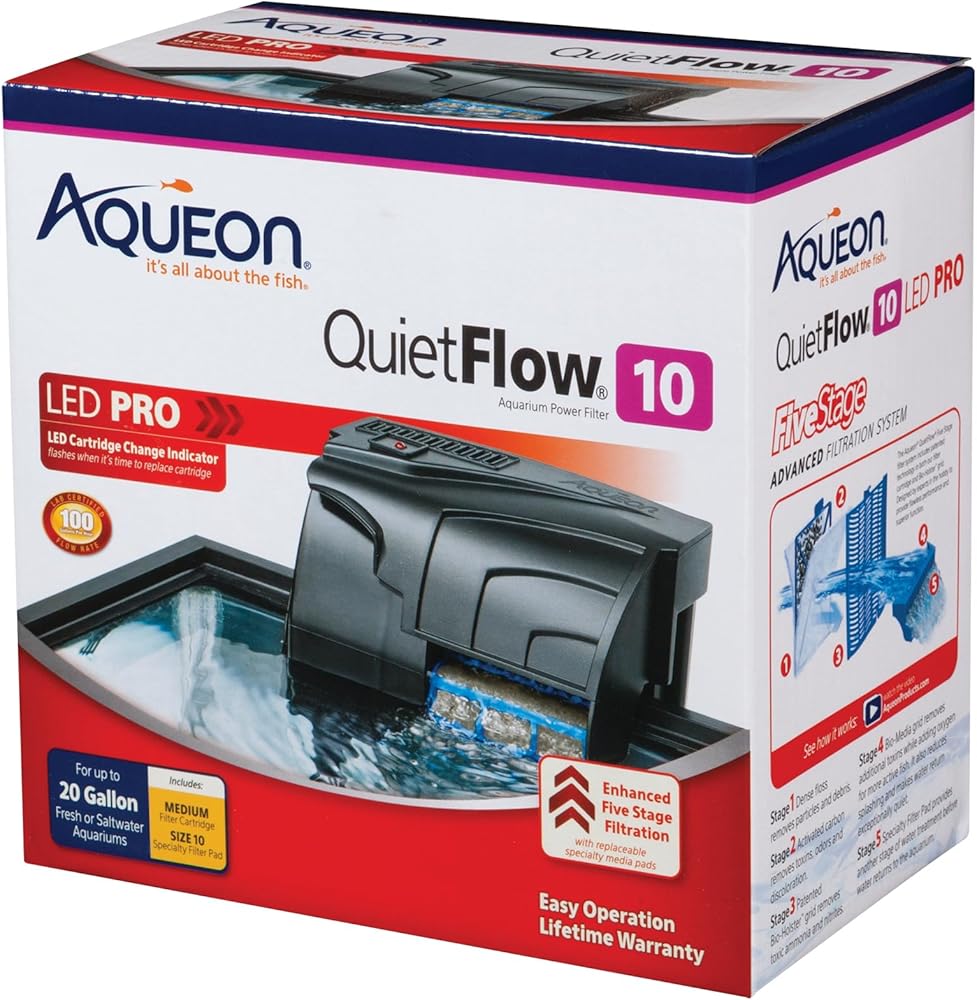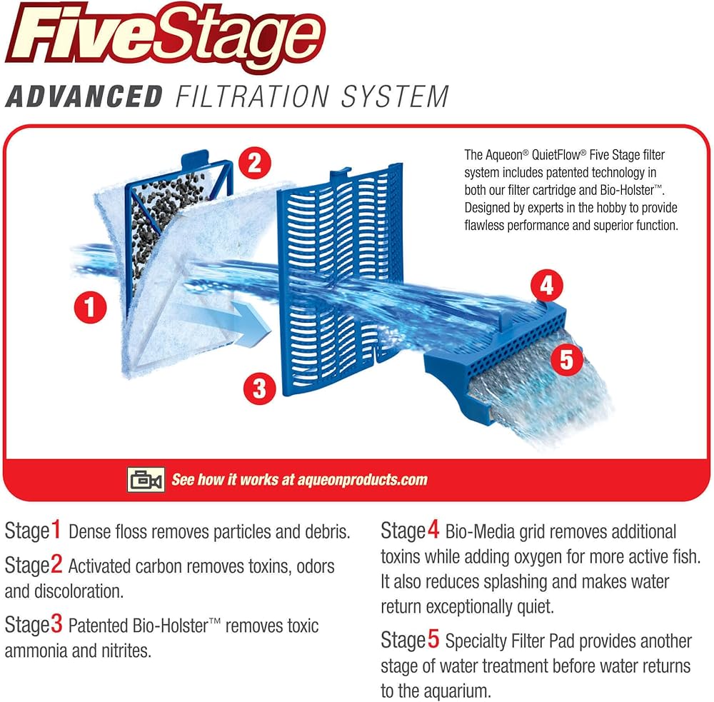 Product Features: Dense floss removes particles and debris Activated carbon removes toxins, odors and discoloration Patented bio-holster removes toxic ammonia and nitrites Diffuser grid removes additional toxins while adding oxygen for more active fish Reduces splashing making the return exceptionally quiet Product Specifications: Manufacture: Aqueon Model: 6079 Manufacture Part Number: 6079 Approximate Product Dimensions: 12.9" x 8.4" x 6.6" (Length x Width x Height)