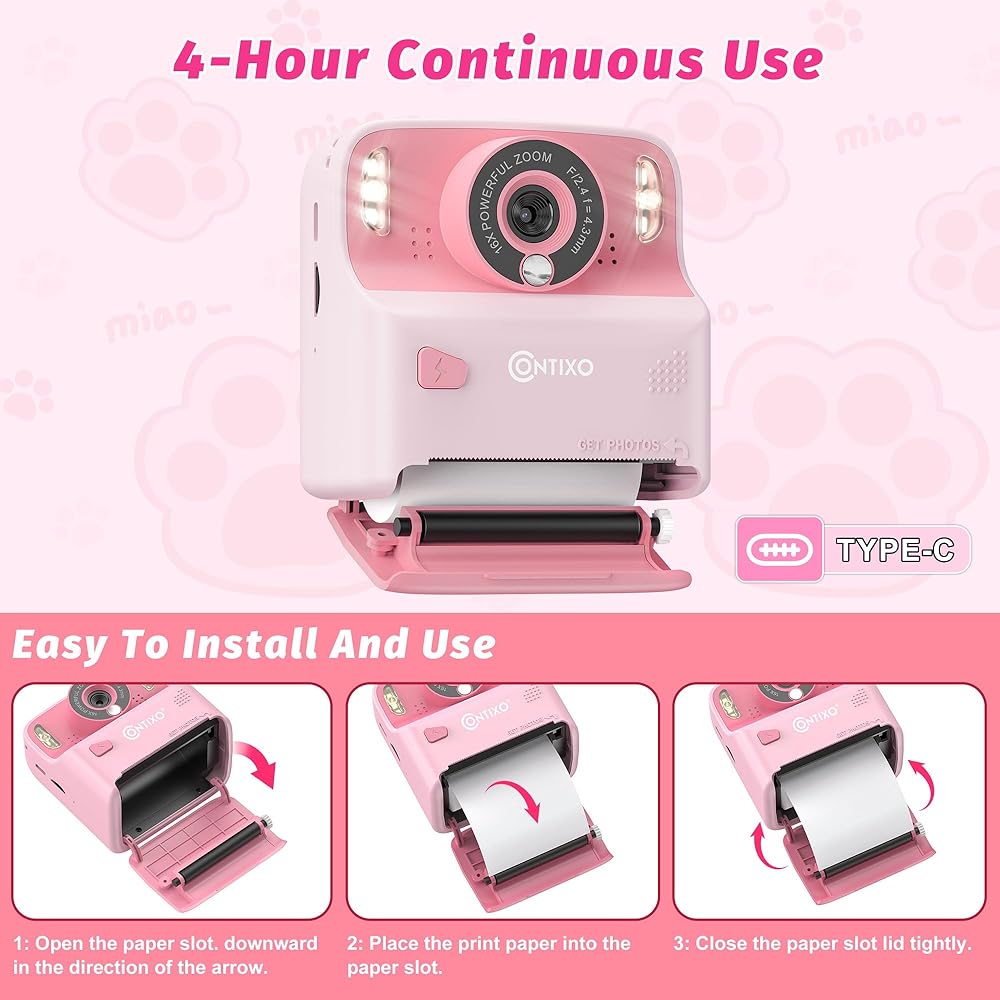 • KIDS DIGITAL CAMERA Photo Booth - Our product serves as a photo booth, equipped with a 2.4-inch screen and 3 x Printing Paper Rolls. You'll have your loved kid camera go film ready in no time with Contixo camera with film bundle.