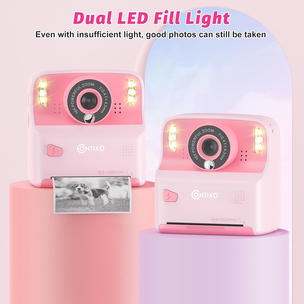 Contixo instant film camera, the perfect kids birthday present. Your little ones will love this kid camera, perfect for capturing life's precious moments. This kids camera 3 year old is more than just a toy. It's a tool for creativity, learning, and fun. With its 16x digital camera and 1080P quality, your kids can take high-quality photos with ease. The camera resolution is a stunning 12MP, providing crisp and clear images. The Contixo instant camera comes with 3 x printing paper rolls, ensuring endless hours of photo-taking fun.