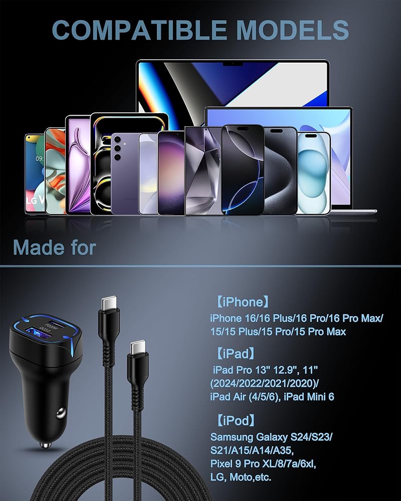 38W USB C Car Charger with 3-foot USB C Charging Cable