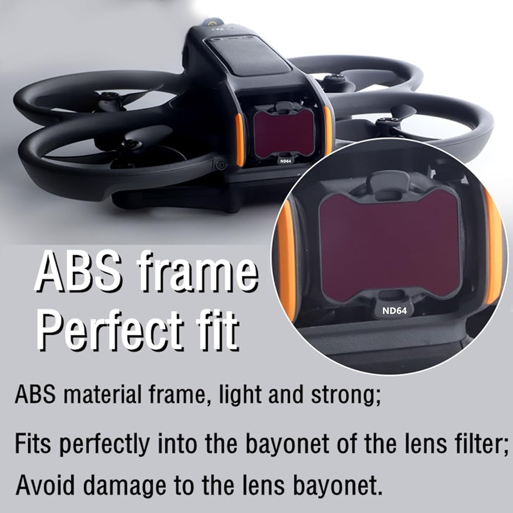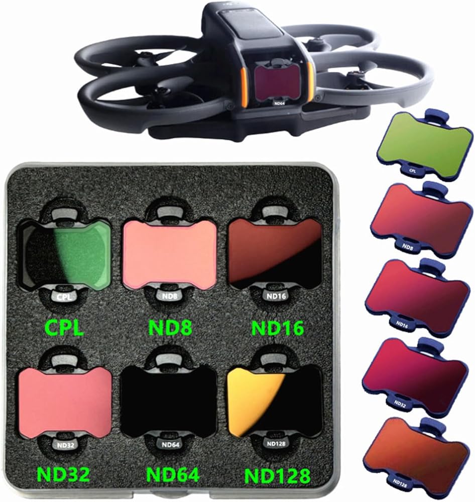 Yadsux's 6-pack filter kit is designed for DJI Avata 2 and includes CPL, ND8, ND16, ND32 ND64 and ND128. Using a PC frame, high-definition optical glass filters, light weight, ultra-thin, instant adhesion, help to enhance color, reduce glare and light control in a variety of scenes, is an excellent photography tool set for drone enthusiasts