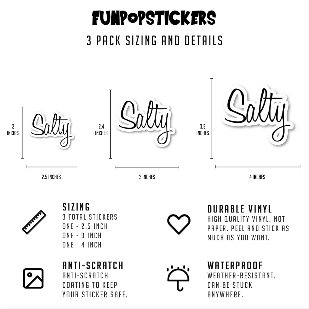 Salty - 3 Pack - (1) 2.5, (1) 3, (1) 4 Inch Stickers Vinyl Stickers - 2.5, 3 And 4 Inches - Trendsetter Collections Stickers - Waterproof High Quality Vinyl Stickers. Super Simple And Easy To Add To Any Laptop, Phone, Tablet, Care And More. These Are The Perfect Stickers For The Sticker Pack Lover At Heart. Peel And Stick As Many Times As You Want, These Low Tact Stickers Are The Perfect Addition. Each Waterproof Sticker Is Made Out Of High Quality Vinyl That Will Not Wear Our Fade. FunPopStickers Is A One-stop Shop For Amazing Stickers For Any Occasion. Trendsetter Collections Vinyl Stickers, Each Sticker Has A Satisfaction Guarantee. Fun Stickers For Any Occasion, Checkout Our Catalog Of Over 2,500 Stickers For Your Laptop, Computer, Phone, Care And More!