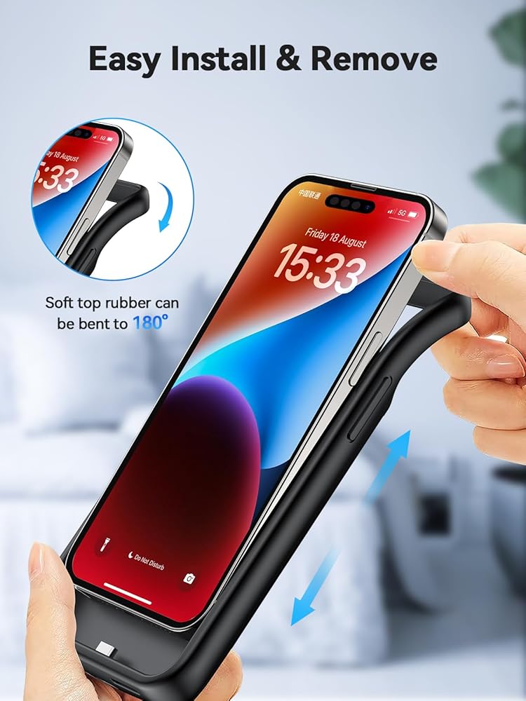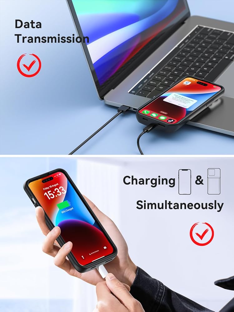 متوافق مع iPhone 15/15 Pro: حافظة البطارية هذه مخصصة فقط لهاتف iPhone 15/15 Pro (6.1 بوصة) وليست مخصصة لهاتف iPhone 15 Plus (6.7 بوصة) أو iPhone 15 Pro Max (6.7 بوصة). تتميز حافظة الشاحن بمنفذ مدمج من النوع C، يرجى استخدام كابل شاحن iPhone الأصلي لشحن علبة البطارية.