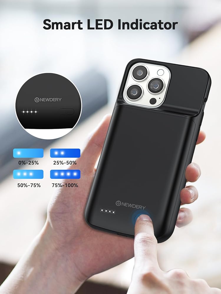 عمر بطارية ممتد بنسبة 110%: توفر حافظة الشحن الممتدة NEWDERY بقدرة 5000 مللي أمبير في الساعة وقتًا استعدادًا إضافيًا لجهاز iPhone الخاص بك. بفضل سعته العالية وتصميمه النحيف للغاية وقابليته للنقل، فهو مثالي للمستخدمين الثقيلين يوميًا أو الأنشطة الخارجية أو رحلات العمل أو السفر.