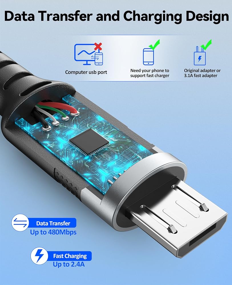 الشحن والمزامنة السريعة: يدعم كابل بيانات micro usb هذا سرعات شحن تصل إلى 2.4 أمبير 12 وات وينقل البيانات بسرعة 480 ميجابايت في الثانية عبر USB 2.0، ونقل البيانات والشحن عالي السرعة 2 في 1