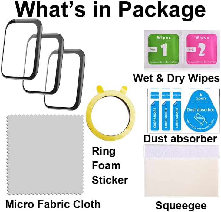 - تتضمن الحزمة: 3 واقيات شاشة ثلاثية الأبعاد، 3 مناديل مبللة جافة، 3 ملصقات لإزالة الغبار، 1 قطعة قماش من الألياف الدقيقة، 1 ممسحة مطاطية، 1 ملصق حلقة رغوية، 1 بطاقة تعليمات DIY