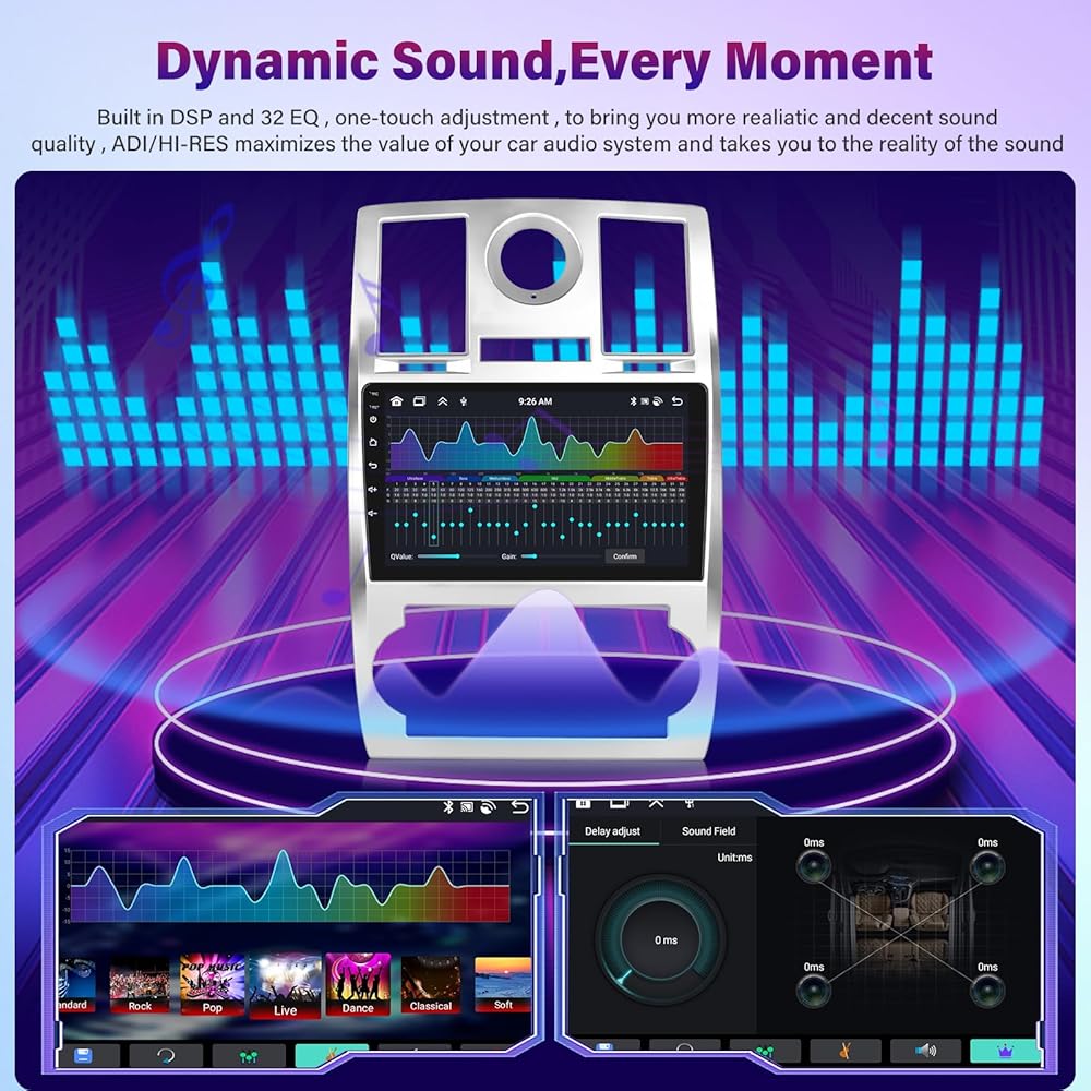 "راديو FM/RDS & DSP + 32 EQ Chrysler Audio:" - يمكن لراديو FM/RDS البحث تلقائيًا عن المحطات وحفظ 54 محطة محجوزة، والبحث الواضح عن القنوات والضوضاء المنخفضة. باستخدام تقنية DSP (معالج الإشارة الرقمية) المتقدمة، يمكنك ضبط 4 مكبرات صوت بشكل فردي ومع تعديل 32 معادل صوت لإنشاء مؤثرات صوتية مثل حفلة موسيقية حية والاستمتاع بهذا الصوت في السيارة. اضبط الصوت بدقة حسب رغبتك، وقم بضبط كل تردد بدقة للحصول على رحلة استماع مخصصة حقًا