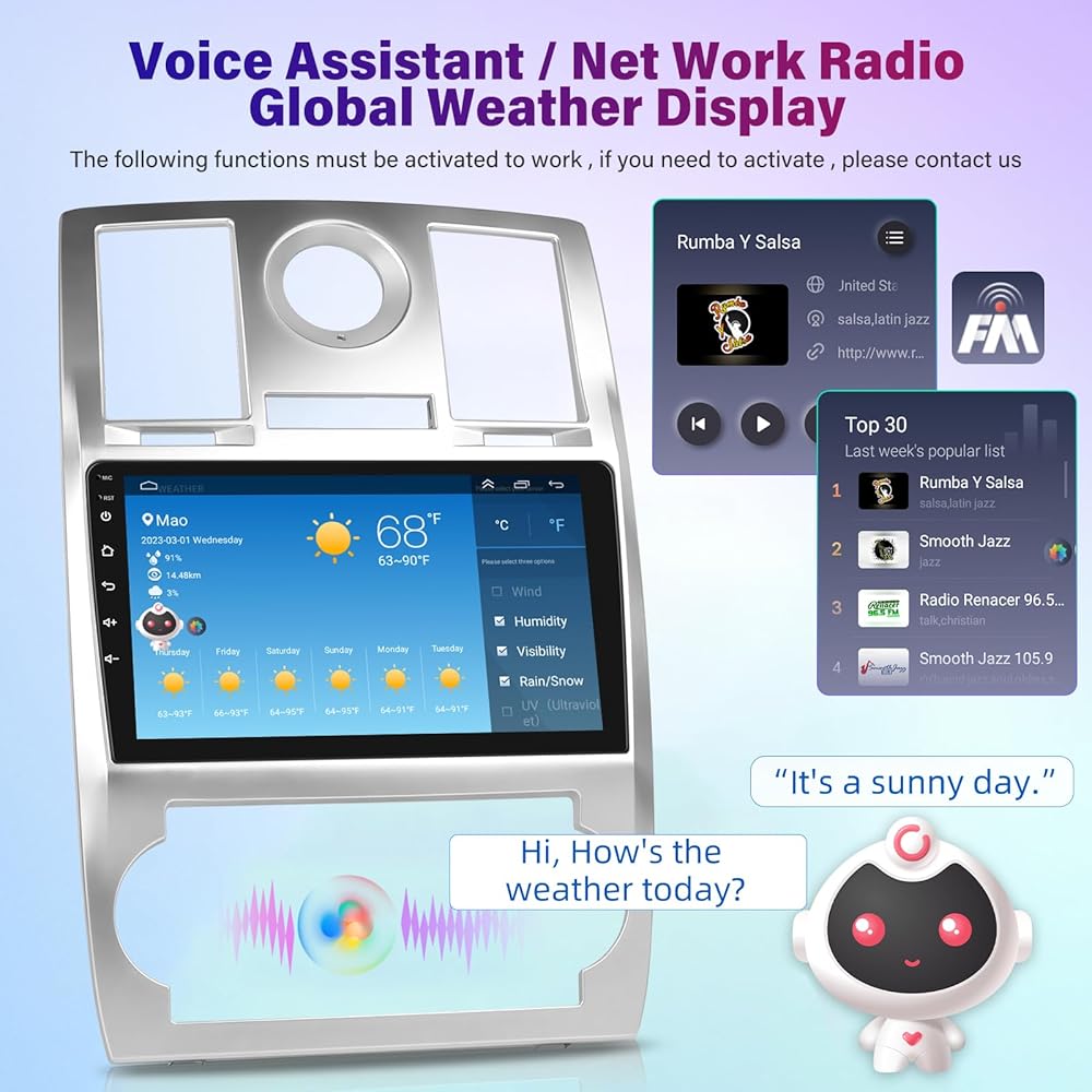 "Wireless CarPlay & Wireless Android Auto & Mirror Link:" - مع إمكانيات Apple Carplay وAndroid Auto اللاسلكية، يمكن للمستخدمين توصيل هواتفهم المحمولة بالوحدة الرئيسية لسيارة Chrysler 300C مقاس 9 بوصات. ويدعم المساعد الصوتي الذكي. أثناء القيادة، يمكن للمستخدمين الوصول بأمان أكبر إلى نظام تحديد المواقع العالمي (GPS) للهاتف والمكالمات والرسائل والموسيقى وما إلى ذلك من خلال محادثة بسيطة دون لمس الشاشة. يدعم وصلة مرآة هواتف IOS وAndroid لمزامنة هاتفك الذكي مع شاشة الراديو