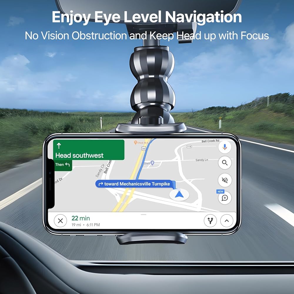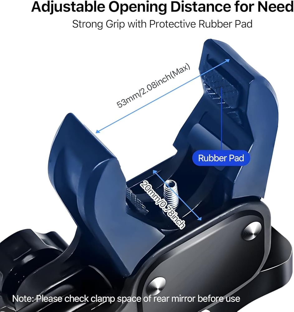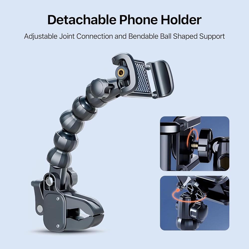 • 【Stable Grip & Enhanced Safety】Equipped with a strong and durable clamp, the phone holder securely holds your device in place, even on bumpy roads. The soft silicone pads protect your phone from scratches and ensure a stable, slip-free hold.The sturdy construction and thoughtful design make it easy to access your device without taking your eyes off the road, enhancing your overall driving experience.