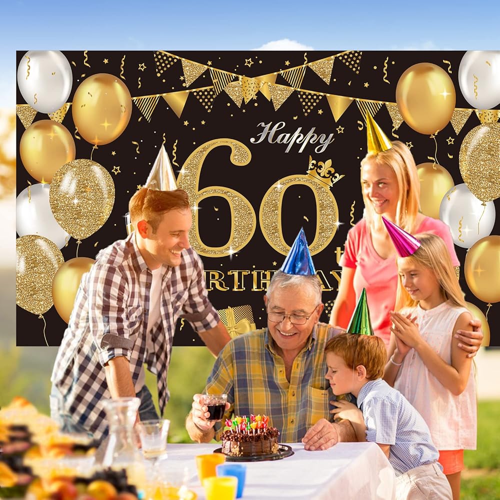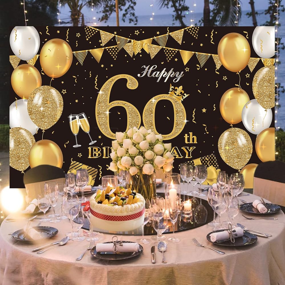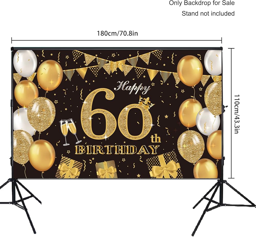 زينة حفلة عيد الميلاد الستين، ملصق لافتة كبير جدًا باللونين الأسود والذهبي، لوازم حفلات عيد الميلاد الستين، لافتة خلفية للذكرى الستين، لافتة خلفية للصور