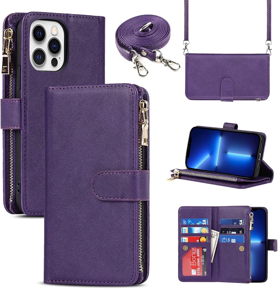 Crossbody Wallet Case for iPhone 13 With Card Slot Holder, PU Leather Zip Pocket Folio Purse Flip Case Magnetic Closure Handbag with Detachable Lanyard Strap for iPhone 13 -- Green