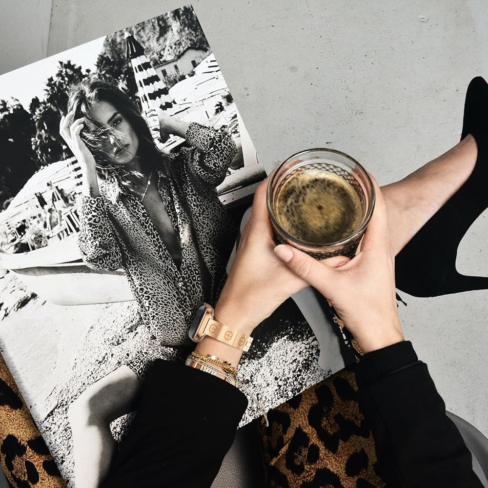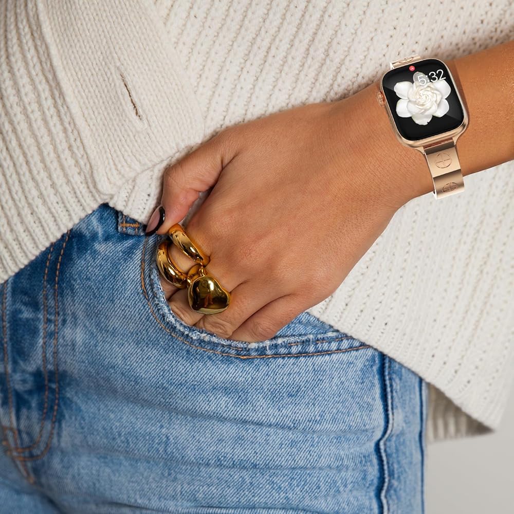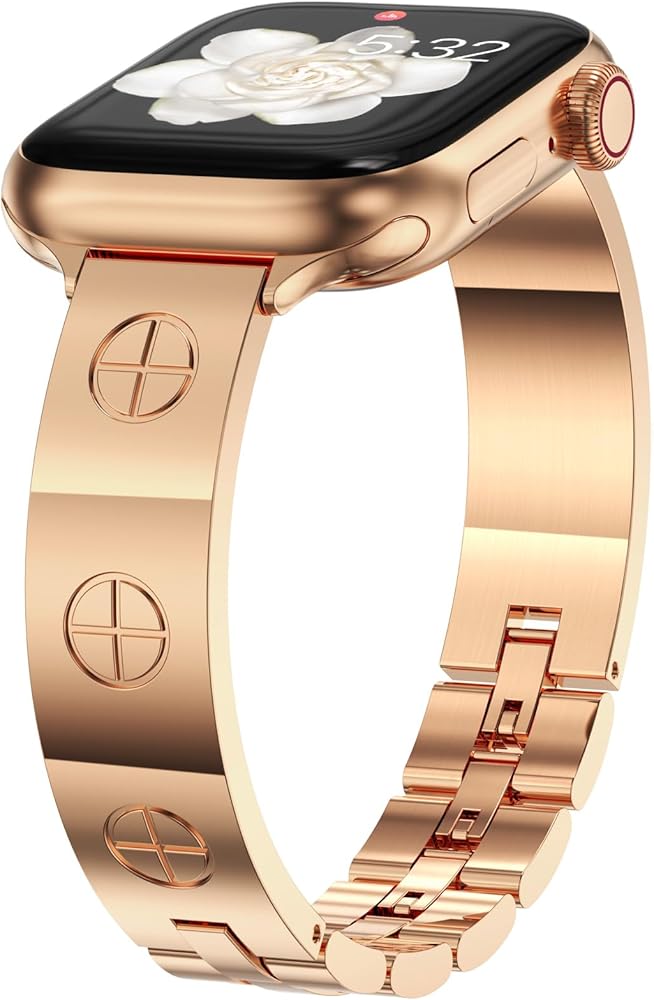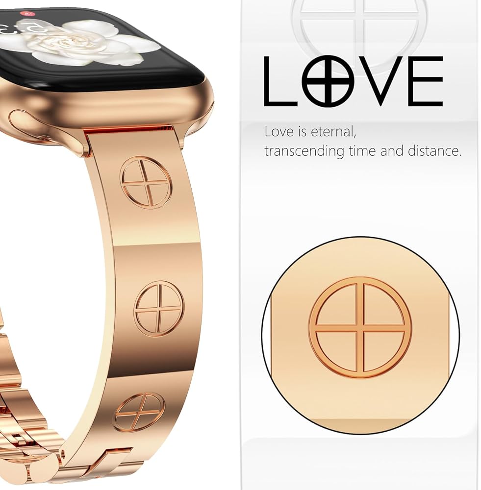 diamond metal band adds sparkle to your watch - Compatible with Apple Watch Series 8/7/6/5/4/3/2/1SE/Ultra - Clover is simple and stylish [Unique Design] This luxury apple watch band features the most popular four-leaf clover design, it Symbolizes luck and hope. This rose gold apple watch band uses diamond-encrusted craftsmanship, revealing dignity and elegance in luxury. You'll get a lot of compliments because of it, and it's the perfect combination of personality and style. [Metal Apple Watch Band] This diamond apple watch band made of high-quality metal material, with shiny rhinestone decoration, well polished, the surface is treated with high-quality protection process, waterproof/sweat-proof, sturdy and durable, bringing you a great wearing experience. A great gift for all kinds of watch strap lovers, suitable for different outfits and occasions. [Compatible Apple Watch] This cute apple watch band is compatible with all apple watch models. Bling apple watch band compatible with apple watch band 38mm 40mm 41mm 42mm 44mm 45mm. It is compatible with Series 7/Series 6/Series 5/Series 4/Series 3/Series 2/Series 1/SE. [EASY REMOVAL LINK] The slim apple band can be resized without tools, you can easily remove the extra apple band link by hand, it fits wrist size of 5.3-7.5 inches. Fits your wrist perfectly. Perfect for everyday use, holiday parties, as a gift for weddings, birthdays, Valentine's Day, Mother's Day, Christmas, Thanksgiving, etc.