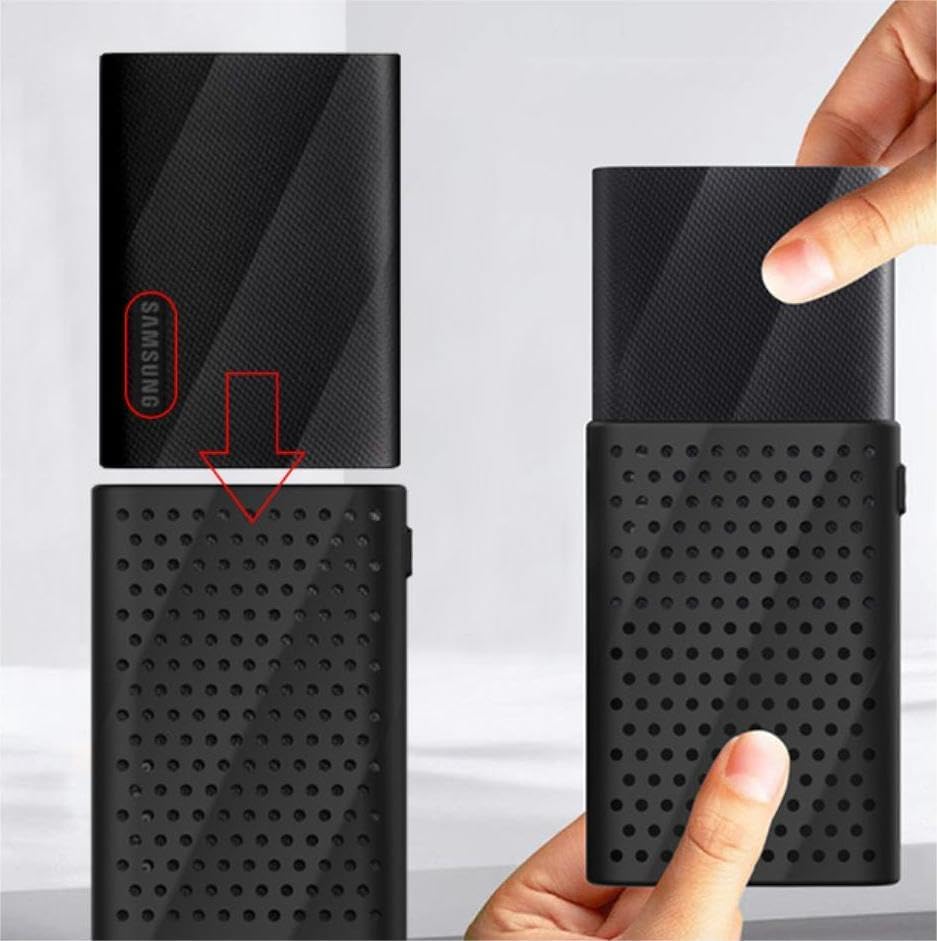 Silicone case for Samsung T9 SSD. Real machine open mold, retain the perfect curve of the real machine, intimate protection. The front side has hollowed out ventilation holes to help dissipate heat. Send the same color silicone lanyard, easy to carry. Shipping list: protective case x1+ lanyard x1.
