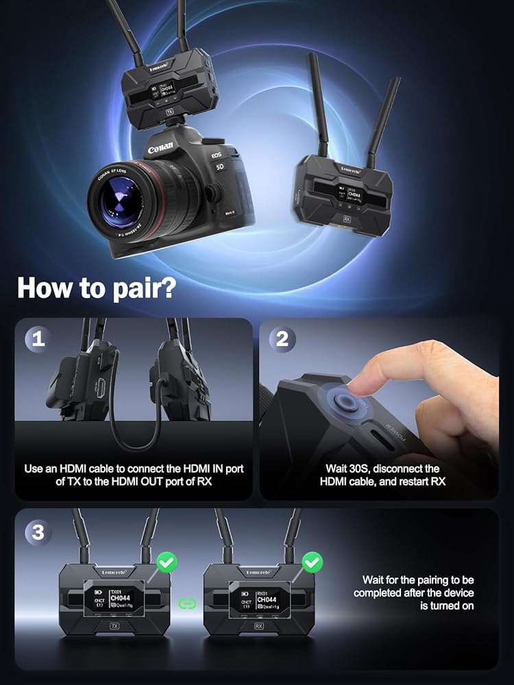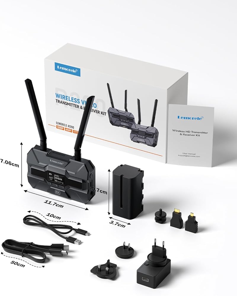 【خدمة ما بعد البيع وقائمة المنتجات الدائمة】توفر Lemorele دائمًا ضمانًا للمنتج لمدة عام واحد، ويمكنك طلب الإرجاع والاستبدال غير المشروط، والحفاظ على خدمة عملاء بشرية عبر الإنترنت على مدار 24 ساعة للترحيب باستفساراتك في أي وقت. قائمة المنتجات: 1 * جهاز إرسال، 1 * جهاز استقبال، 4 * هوائيات، 2 * بطاريات 4400 مللي أمبير في الساعة، 2 * كابل HDMI، 2 * كابل USB C، 2 * محول الطاقة، 1 * حذاء بارد، 1 * محول mirco-hdmi، 1 * محول HDMI صغير، يدوي.