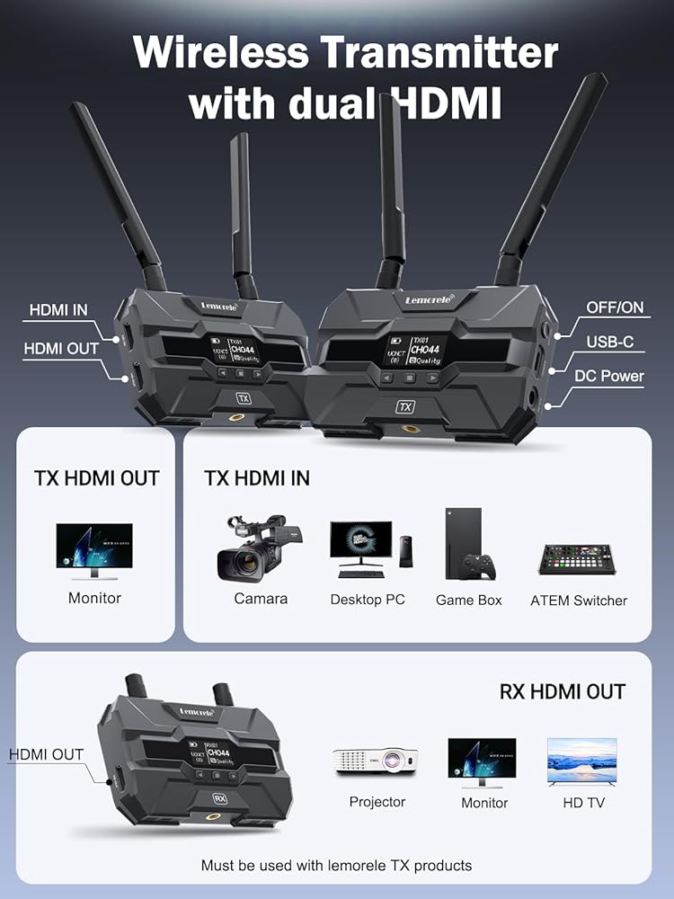 🎬【مجموعة فيديو HDMI لاسلكية مع بطارية 4400 مللي أمبير في الساعة وشاشة OLED】مجموعة جهاز إرسال واستقبال الفيديو اللاسلكي من Lemorele مجهزة بحلقة خارجية لنقل لمسافات طويلة جدًا؛ يمكن لشاشة OLED عرض حالة الجهاز، وهي مجهزة بحذاء بارد مخصص، مما يجعل التثبيت أكثر استقرارًا وملاءمة؛ وفي الوقت نفسه، توفر لك البطارية ذات السعة العالية قدرة تحمل فائقة. يستخدم بشكل أساسي في التصوير الخارجي، والبث المباشر، والمباراة الرياضية، والحفلات الموسيقية الصغيرة، وحفلات الزفاف، وما إلى ذلك.
