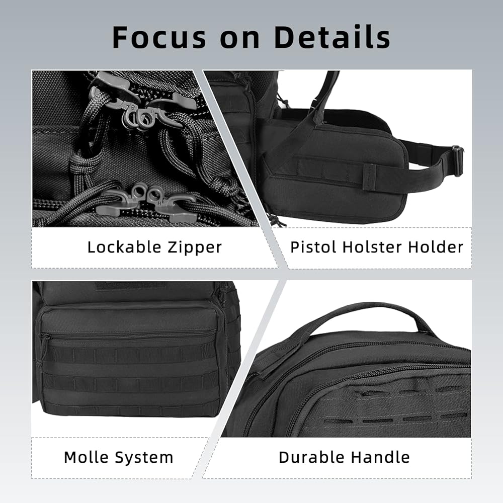 تتضمن حافظات المسدس: تأتي حقيبة الظهر التكتيكية هذه مع 5 حقائب تخزين مسدس قابلة للإزالة، وحافظات المسدس هذه مبطنة وتوفر مساحة تخزين لمسدس واحد ومجلتين لكل منهما. تضمن السحابات المتينة القابلة للقفل بقاء مسدساتك المخزنة آمنة. 8 فتحات إضافية للمجلات متضمنة في الجيب الجانبي الأيسر.