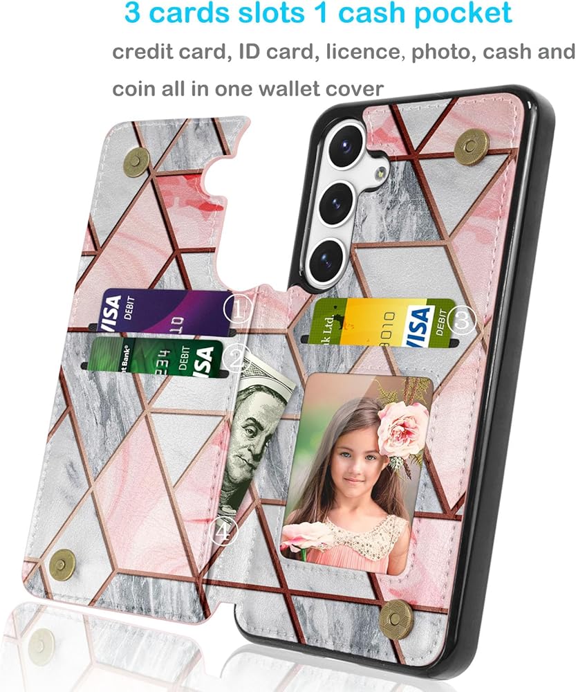 [Reasonable Storage] Case For Galaxy S24+ Plus, This cover case is also multi-functional. Built-in 3 card pockets ,1 picture slot& 1 cash slot conveniently store your ID, license, money and credit cards.