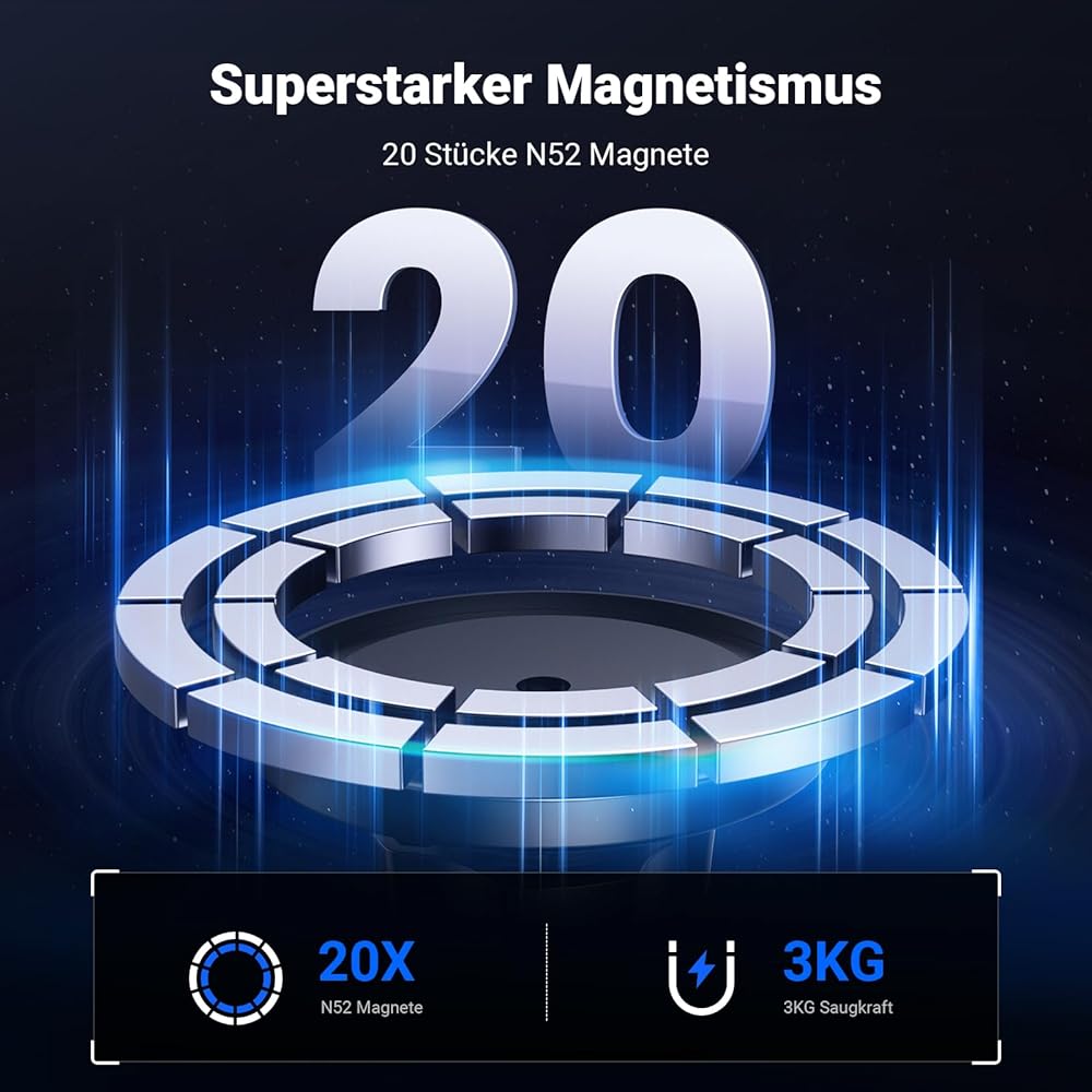 جاذبية مغناطيسية قوية للغاية: يتميز حامل الهاتف المغناطيسي هذا بـ 20 مغناطيسًا فائقًا N52 مطورًا، مما يضمن قبضة آمنة وموثوقة لهاتفك. حتى أثناء الكبح المفاجئ، أو المنعطفات الحادة، أو الركوب الوعرة على الطرق غير المستوية، سيظل هاتفك مستقرًا بشكل لا يصدق دون أي قلق بشأن سقوطه.