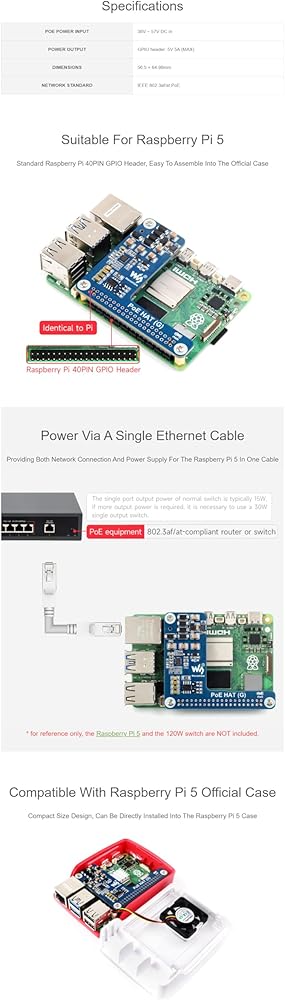 PoE HAT compatible with Raspberry Pi 5, PoE capability,IEEE 802.3af/at-compliant