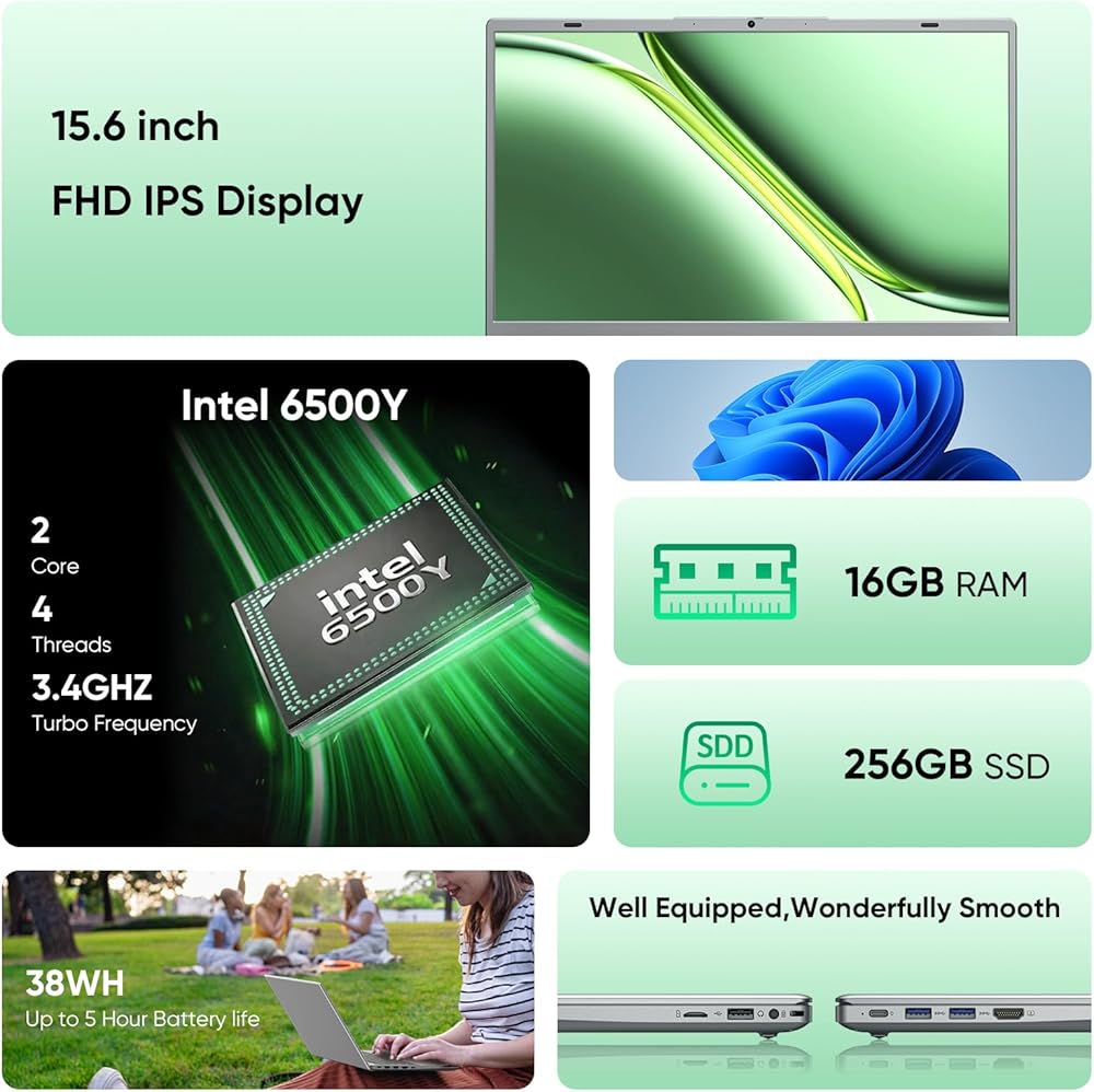 كمبيوتر محمول عالي الدقة مقاس 15.6 بوصة مع ذاكرة وصول عشوائي سعتها 16 جيجابايت ومحرك أقراص SSD سعة 256 جيجابايت، كمبيوتر محمول، معالج ثنائي النواة 6500Y يصل إلى 3.4 جيجا هرتز، WiFi5، USB-C، أجهزة كمبيوتر محمولة قابلة للنقل للأعمال والطلاب، فضي