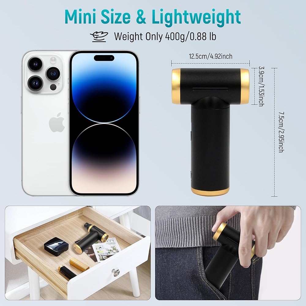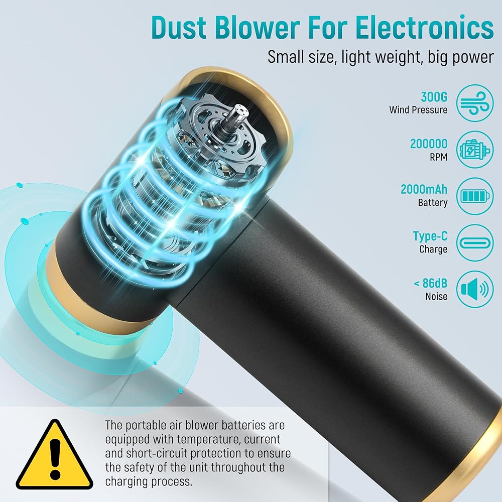 Minimal PORTABLE: The compressed air duster electric measures 4.92*2.95*1.53 inch and weighs 0.88 lb, it is easy to carry, lightweight, and space-saving, put it in your pocket without any pressure. The rechargeable air duster battery is equipped with temperature protection, current protection and short circuit protection, to ensure the safety of the device throughout the charging process. The air duster is the best choice for home, office, and car dust cleaning.