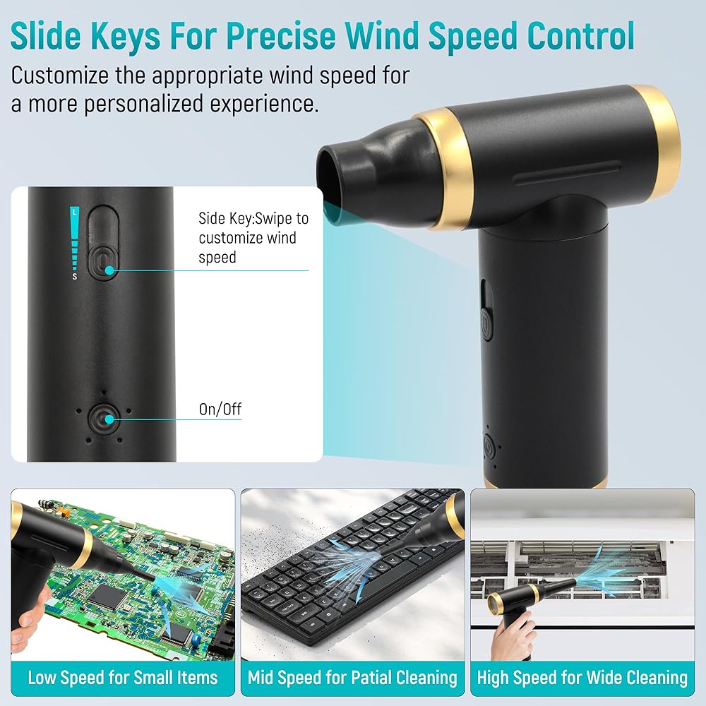 POWERFUL PERFORMANCE: The electric duster motor spins at a maximum speed of 200,000 RPM, a long press of the switch turns the unit on and off for 3 seconds, blowing and vacuuming dust in 2 in 1, and the sliding button allows you to customize the airflow to suit your different cleaning needs. The air duster for pc easily removes dirt hidden in a variety of crevices on your keyboard or any electronic device, the electric duster has powerful winds for superior performance.