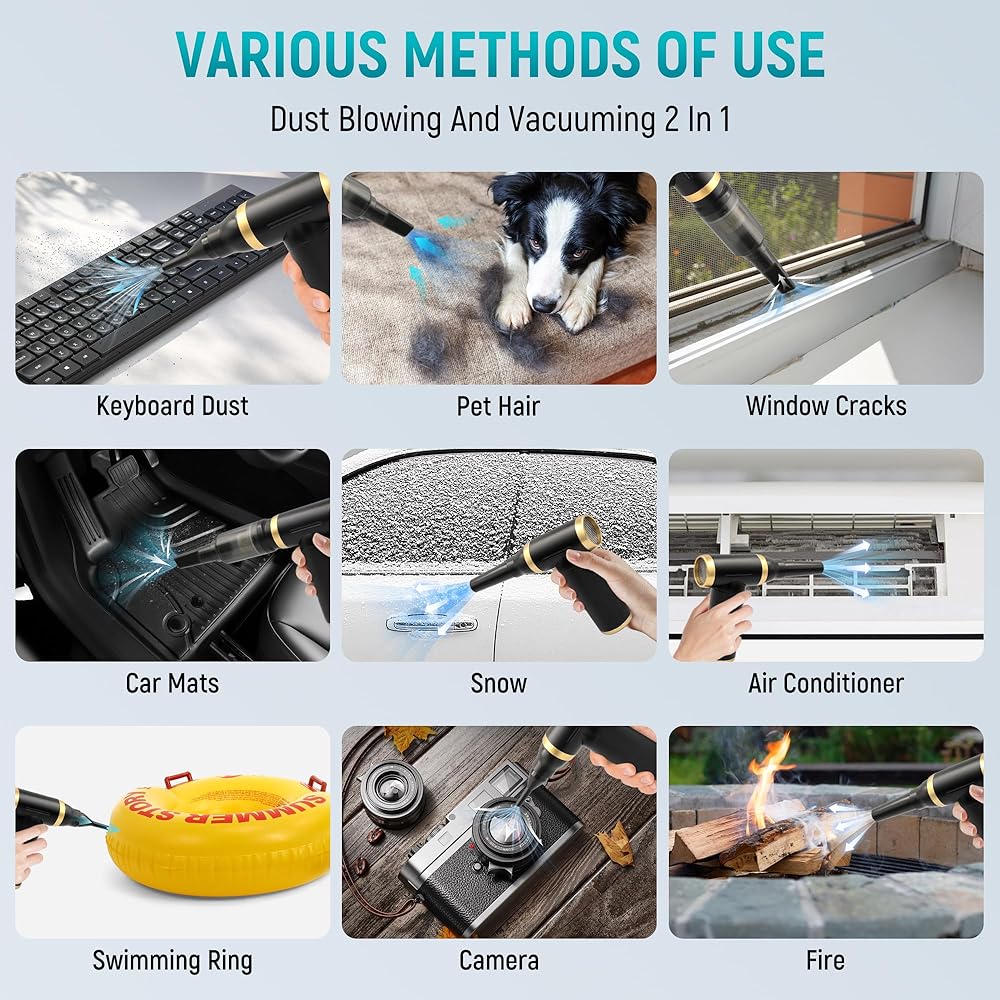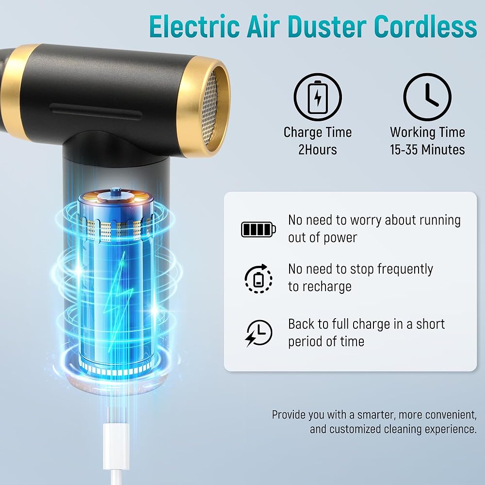 QUICK CHARGE: The compressed air dusters have a built-in 2000 mAh lithium battery that has been tested with 500 charge cycles can work continuously for 20-40 minutes, and takes only 2-3 hours to fully charge each time. Enjoy the convenience of our air duster electric, equipped with fast-charging technology to support long hours of use, so you can get through your cleaning tasks without interruptions.