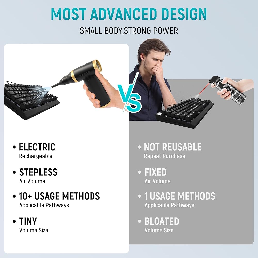 ALTERNATIVE TO COMPRESSED AIR: Compared to a can of air duster for electronics, our computer duster can be recharged and used over and over again, providing you with great convenience in your cleaning tasks. It protects your electronics from liquids. The dust blower can be used multiple times, saving you money and protecting the environment.