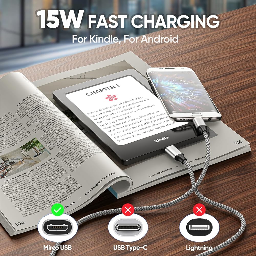 شحن سريع بقدرة 15 وات: سرعة شحن أسرع من معظم كابلات USB إلى micro USB، تصل إلى 15 وات (3 أمبير)، مما يوفر تيارًا قويًا لهواتف Android وKindle
