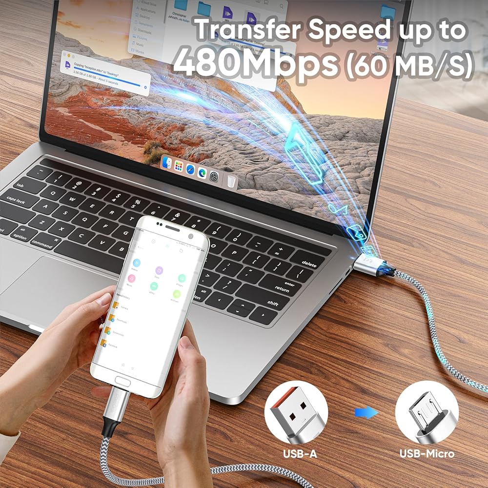 مزامنة بيانات عالية السرعة: يوفر سلك Micro USB أيضًا وظيفة نقل البيانات، مع سرعات نقل تصل إلى 480 ميجابت في الثانية، مما يسمح بالنقل الفوري لملفات الموسيقى والصور والفيديو