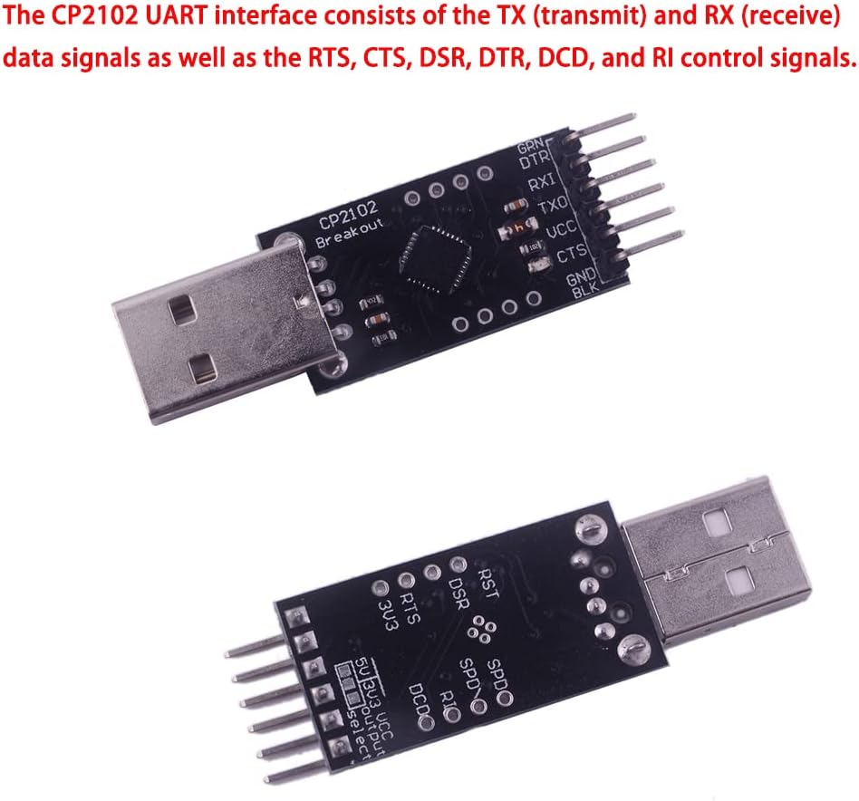 تتكون واجهة CP2102 UART من إشارات البيانات TX (الإرسال) وRX (الاستقبال) بالإضافة إلى إشارات التحكم RTS وCTS وDSR وDTR وDCD وRl.