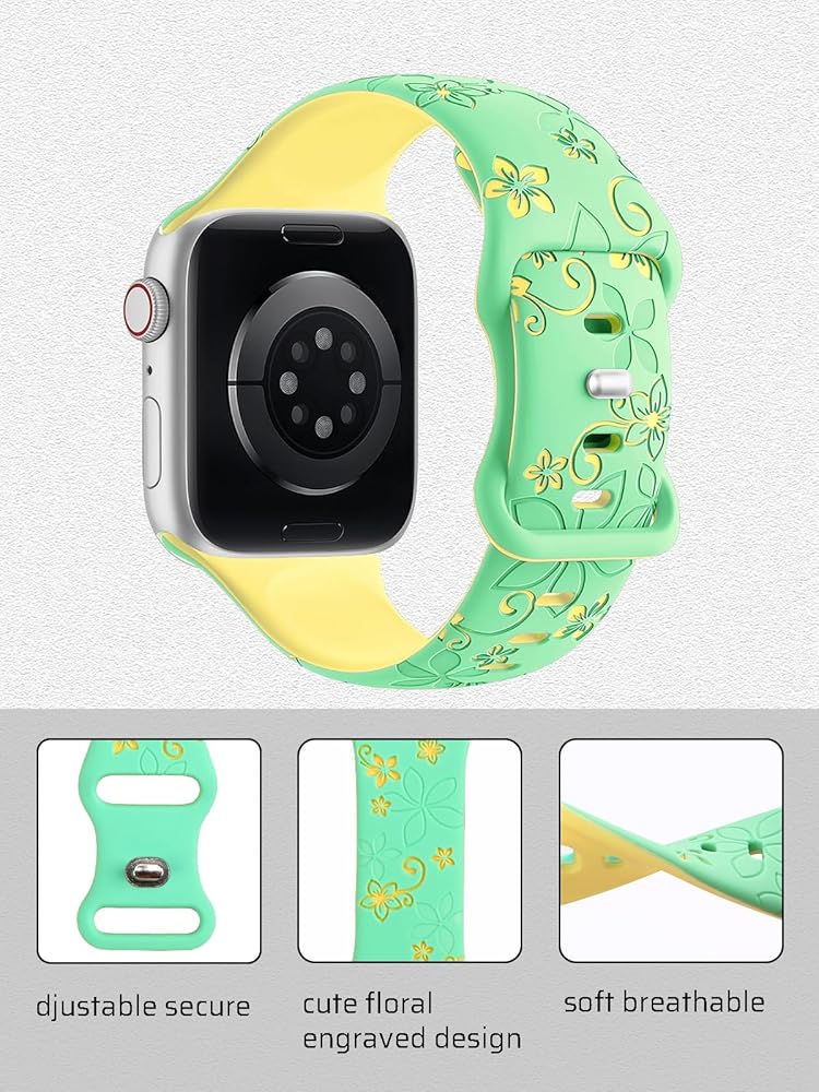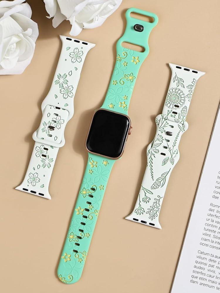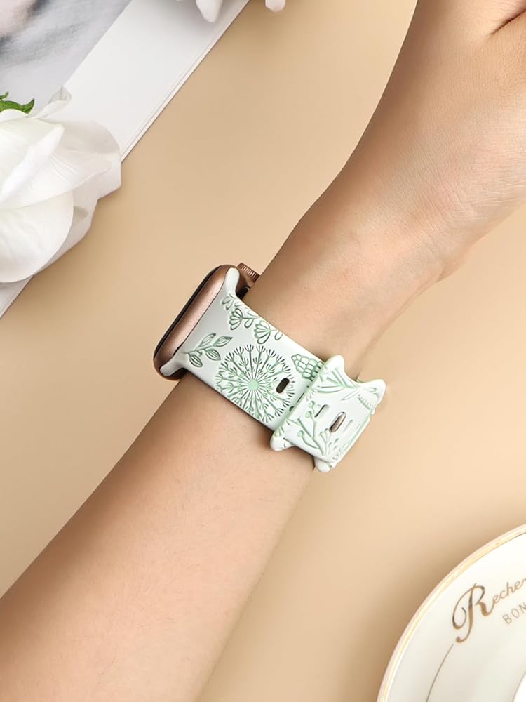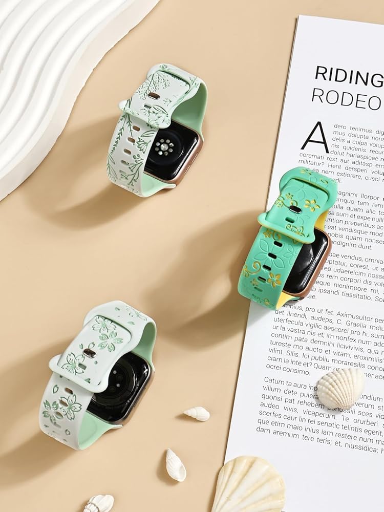 【نماذج متوافقة】 أحزمة iwatch المنقوشة بالسيليكون للنساء متوافقة مع ساعة Apple 40 مم 41 مم 45 مم 44 مم 38 مم 42 مم 49 مم للنساء، لسلسلة iwatch Bands 9، السلسلة 8، السلسلة 7، السلسلة 6، السلسلة 5، السلسلة 4، السلسلة 3، السلسلة 2، السلسلة 1. وساعة أبل SE (الجيل الثاني)، ساعة أبل ألترا 49 ملم، ساعة أبل ألترا 2، تناسب جميع الموديلات. ملحوظة: يرجى التحقق من الطراز الموجود على الجزء الخلفي من ساعتك لاختيار المقاس الصحيح.