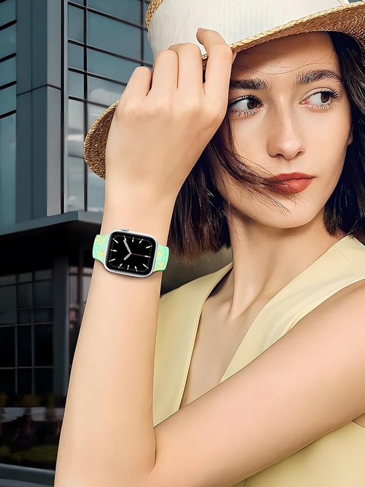 【مادة ممتازة】 سوار الساعة المنقوش بالزهور مصنوع من السيليكون الناعم عالي الجودة، وهو ناعم ومرن ولن يسبب الحساسية لبشرتك. تعمل اللمسة المريحة على تحرير معصمك عند ارتداء سوار ساعة التفاح المصنوع من السيليكون. إنه مريح جدًا للنوم وممارسة الرياضة والارتداء اليومي، مما يمنحك أفضل تجربة ارتداء.