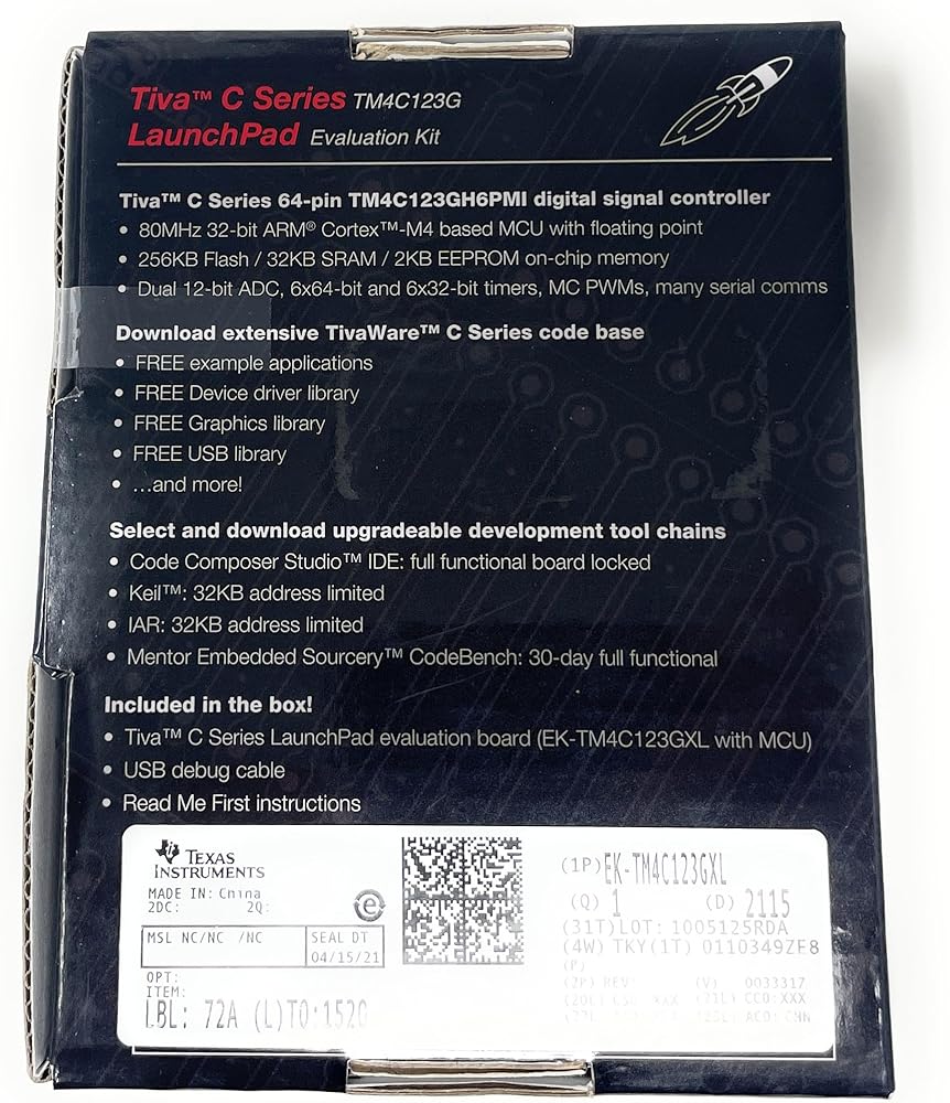 The EK-TM4C123GXL includes programmable user buttons and an RGB LED for custom applications. The stackable headers provide the interface to connect BoosterPack plug-in modules and make it easy and simple to expand the functionality of the TM4C123G LaunchPad through the Texas Instruments BoosterPack ecosystem. The TI-developed TivaWare SDK provides drivers for all peripherals and example code for dozens of applications for the TM4C123G LaunchPad.
