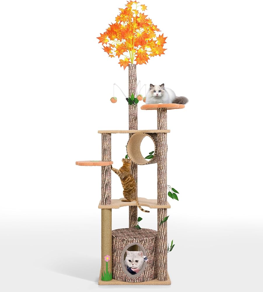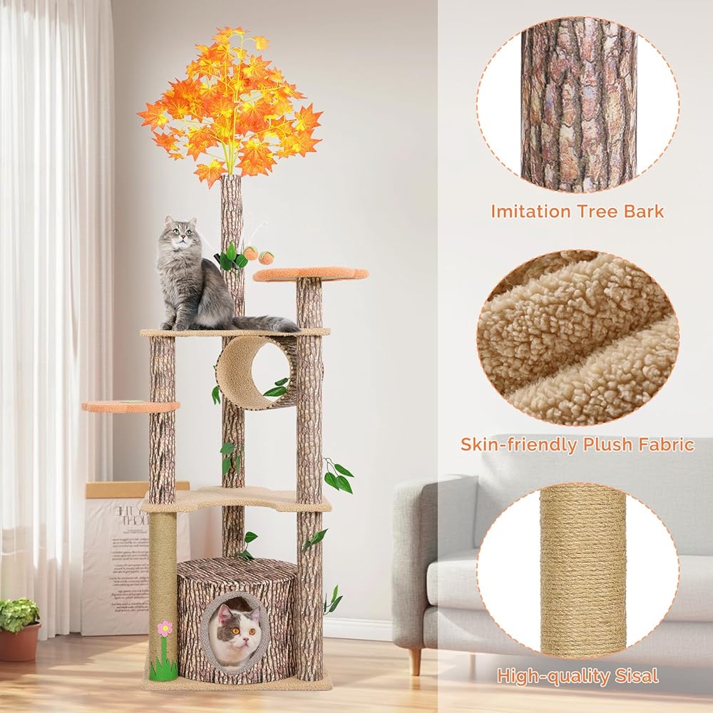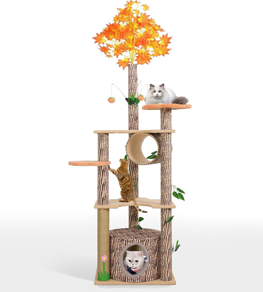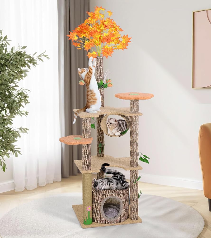 شجرة القط لاكي مونيه مع أوراق للقطط الداخلية، 61 بوصة برج شجرة القط الفريد تحت عنوان الغابة، شجرة نشاط القطط الممتعة مع عمود خدش، شقة، منصة زهرة