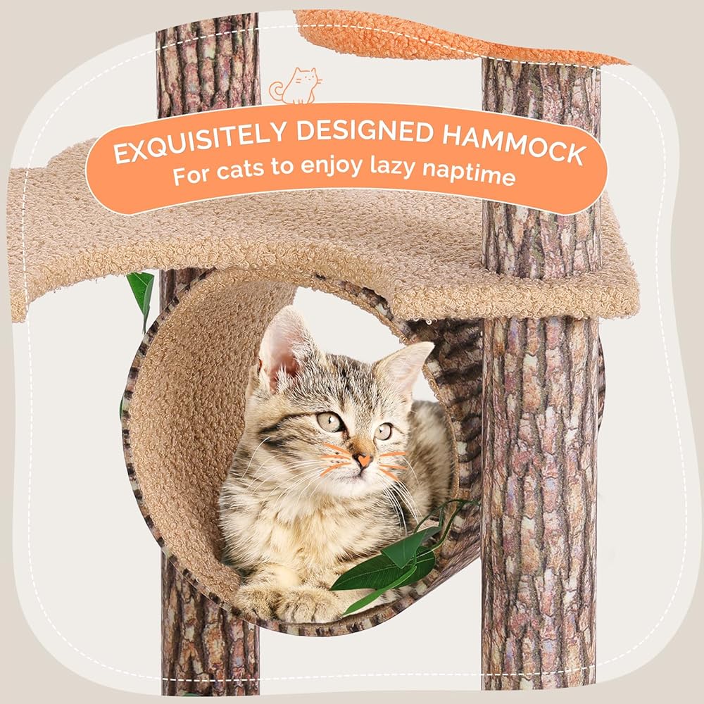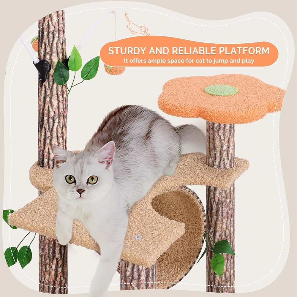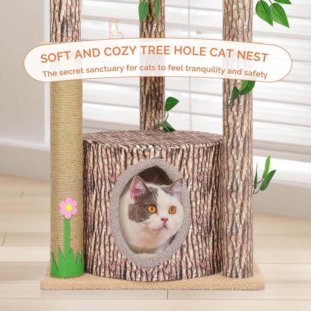 • ❤【Creative Cat Tree】The design of our cat tree takes inspiration from the forest, featuring pillars that mimic tree bark. It includes tree house, flower-shaped platforms and is topped with leaves. With a unique style and attractive color combinations, it stands out from ordinary black or gray cat trees