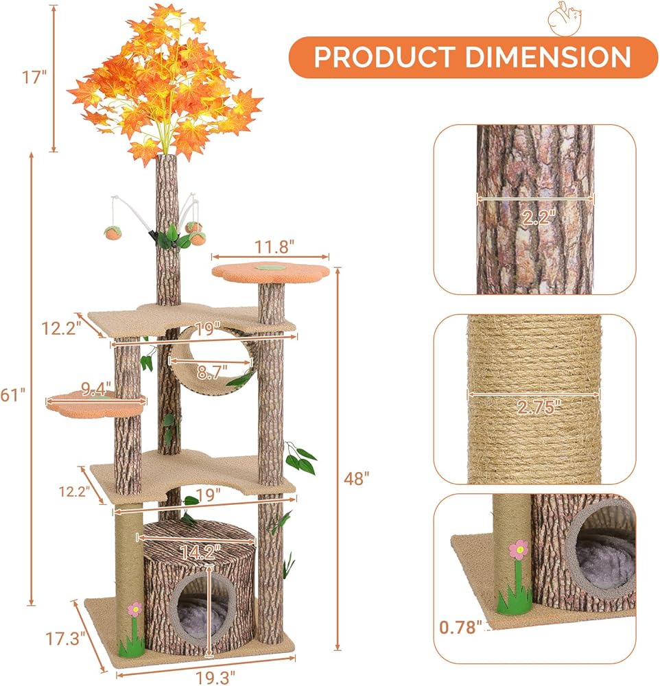 • ❤【Size Info】The cat tower is 19.3"L x 17.3"W x 61"H. Tree house is 14.2" in diameter. Flower platform 11.8". Tunnel 8.7" in diameter.